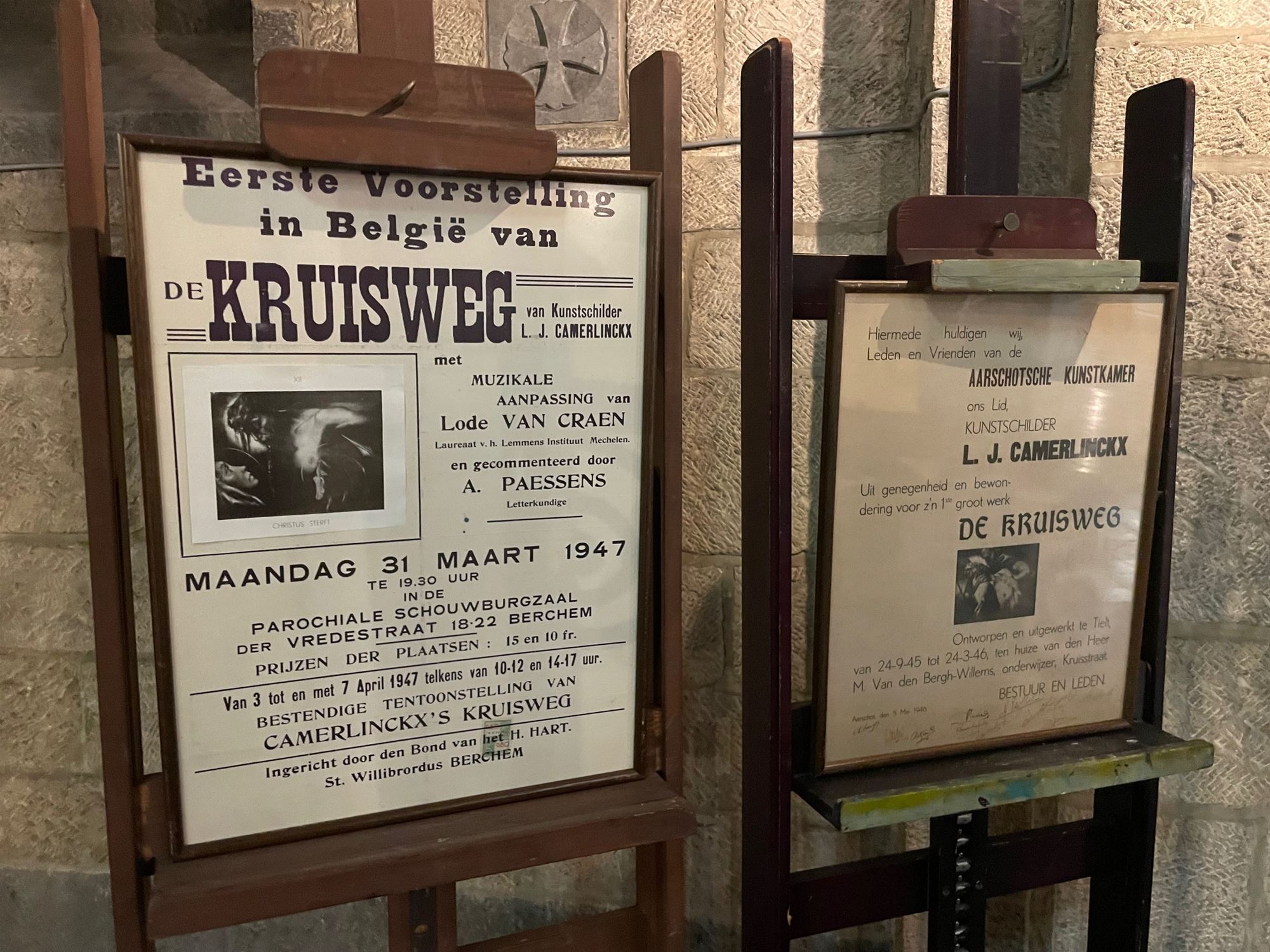 unieke kruisweg van kunstenaar Louis Jacques Camerlinckx. Deze werd geschilderd in 1945 en toont in zwart-wit een zeer creatieve en sprekende kruisweg. De houtskooltekeningen spreken een zelden geziene kracht uit.