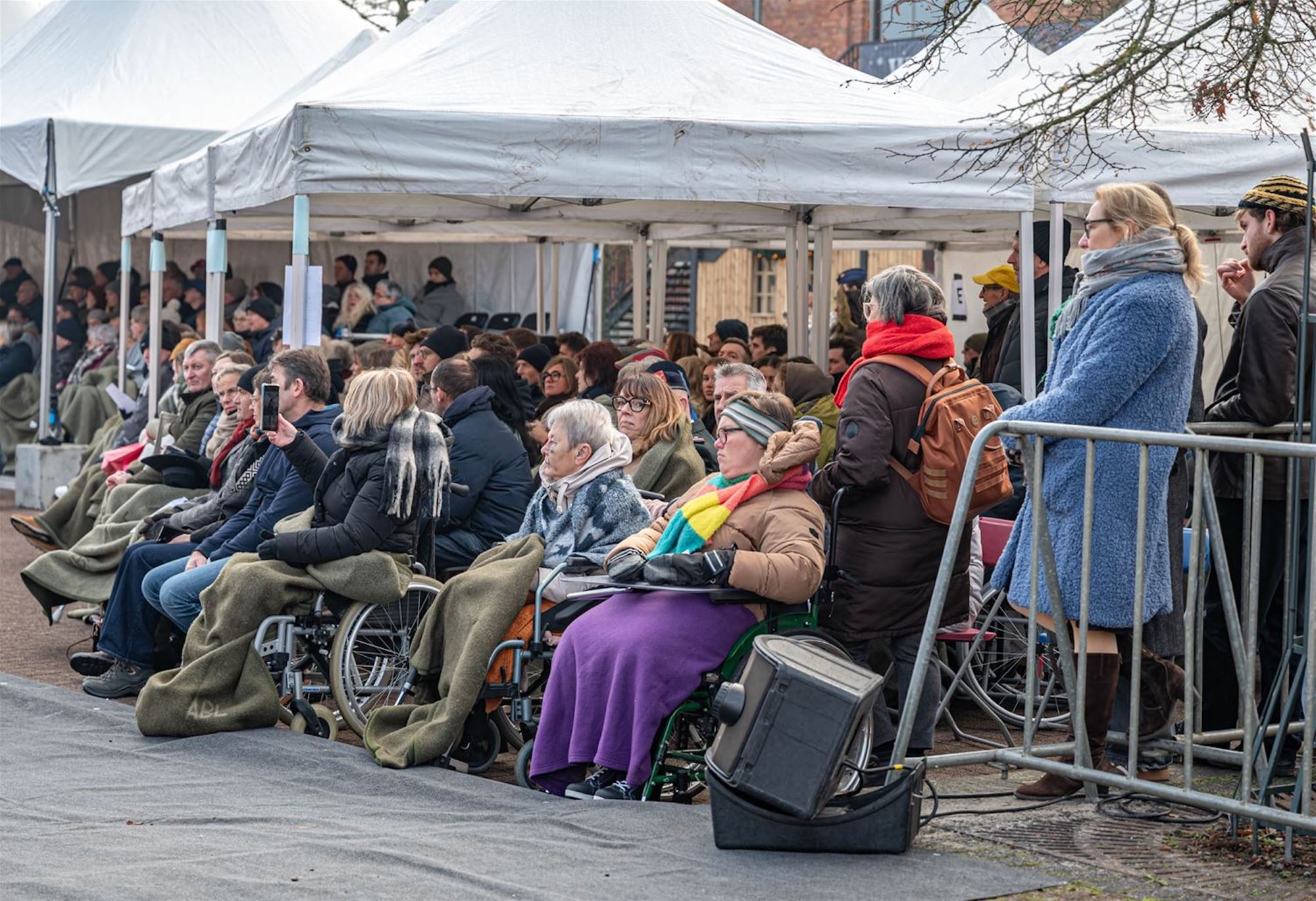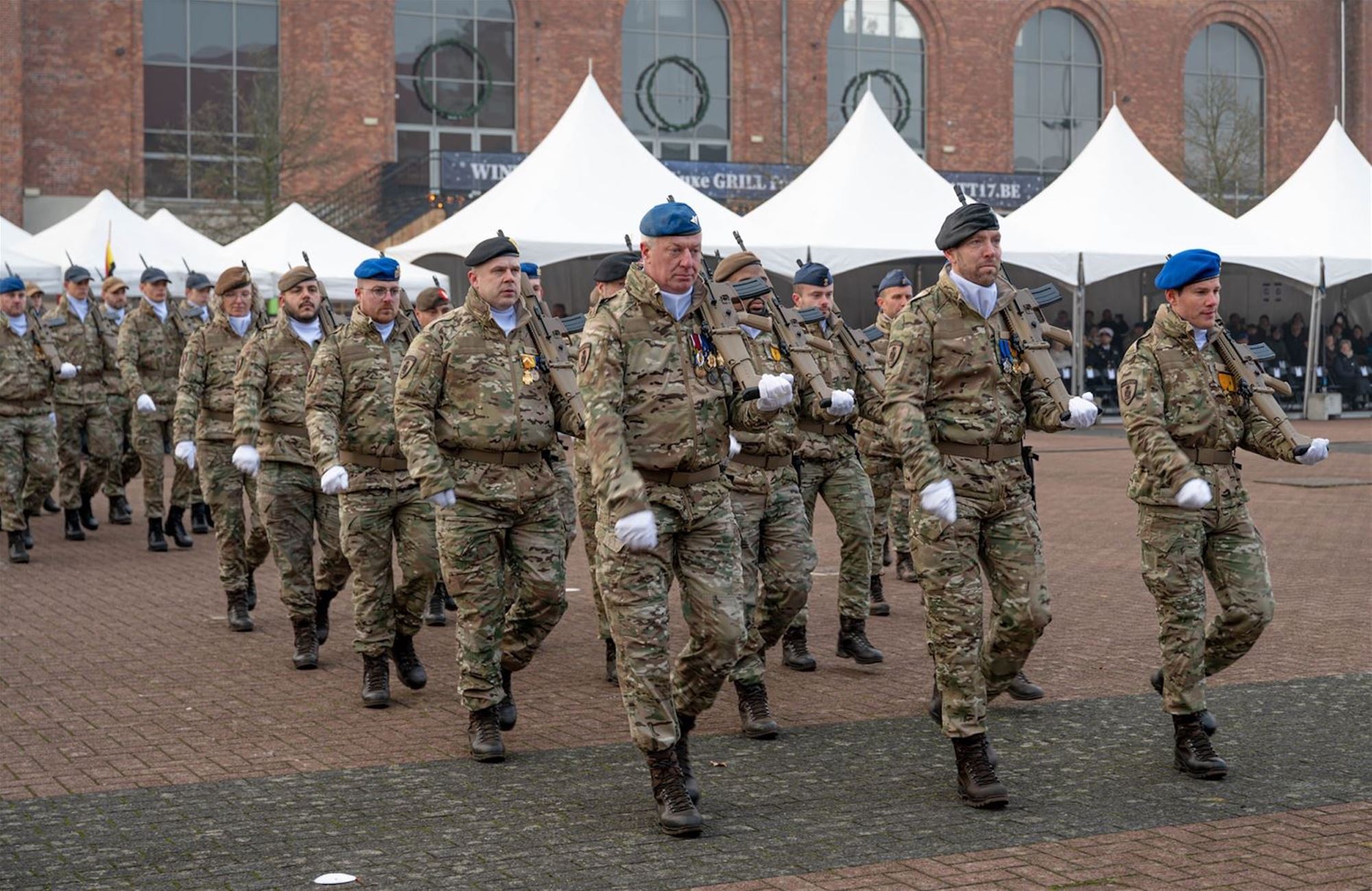 verbroedering van de gemeente Heusden-Zolder met de legereenheid uit Leopoldsburg die precies 60 jaar bestaat. Commandant Bart Grieten en burgemeester Mario Borremans overliepen kort de geschiedenis van dat peterschap en hadden lof voor de rol van defensie en het maatschappelijk engagement. Dat laatste werd meteen in de praktijk gebracht door luitenant-kolonel Grieten die twee cheques van 2.000 euro had voor Dagactiviteitencentrum De Schans en BSBO Heideland, de opbrengst van hun jaarlijkse fietshappening. Afgevaardigden van beide instellingen toonden zich erg dankbaar voor de weerkerende steun, die van pas komt want beide krijgen niet alles gefinancierd met subsidies. Even later mochten ze nog eens naar voor komen, want de militairen in opleiding hadden een koekjesverkoop gehouden en dat bracht nog eens voor elke organisatie 3.000 euro in het laatje. Opvallend was ook de groep leerlingen van de richting Veiligheid van het Sint-Franciscuscollege, onder leiding van militaire kwamen ook zijn opgemarcheerd en namen hun plaats op het plein in.