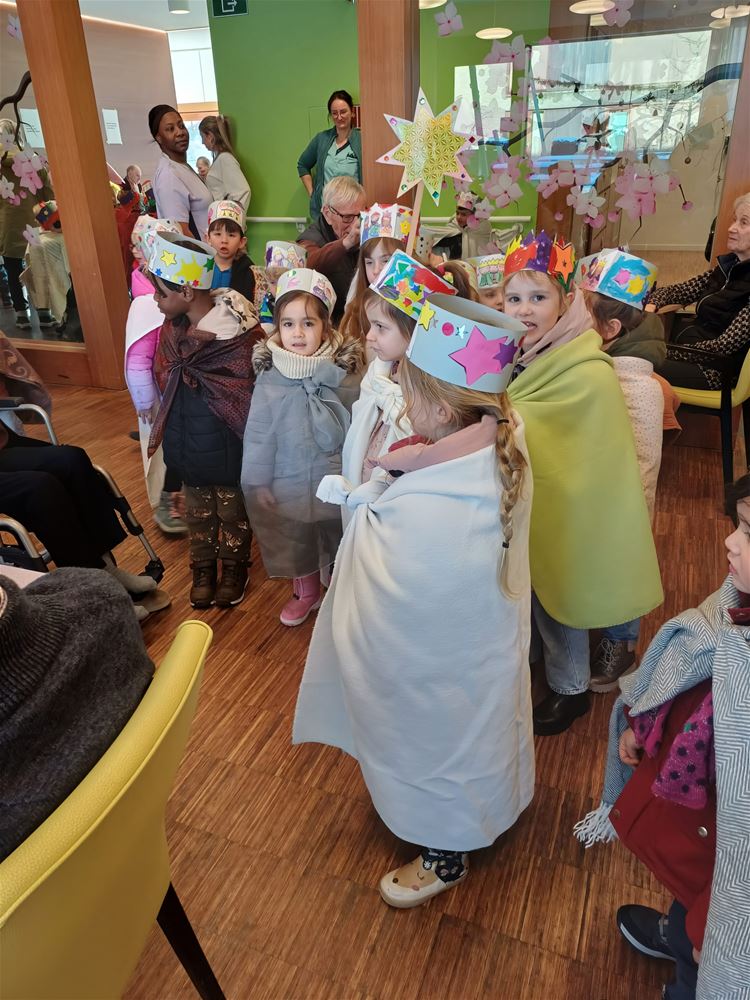 Hoevezavel. Met hun vrolijke Driekoningenliedjes en stralende glimlachjes zorgden de kleuters voor een warme sfeer en heel wat blije gezichten bij de bewoners.