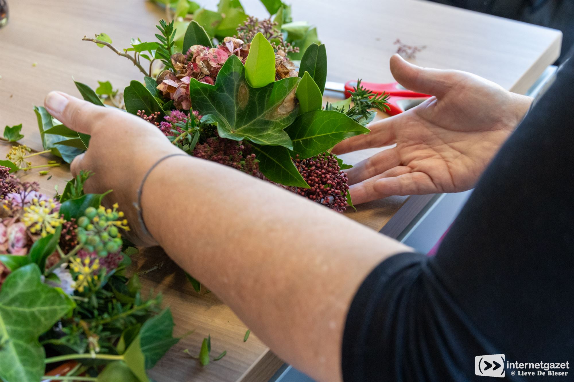 De tafel zat goed vol met enthousiaste, creatieve dames én enkele kinderen, die met klimop, groenblijvende takken en kleurrijke bloemen een prachtig grafstukje maakten. Iedereen ging zelfstandig aan de slag en toverde, helemaal op eigen houtje, een mooi kunstwerkje tevoorschijn dat ze nadien trots mee naar huis mochten nemen.