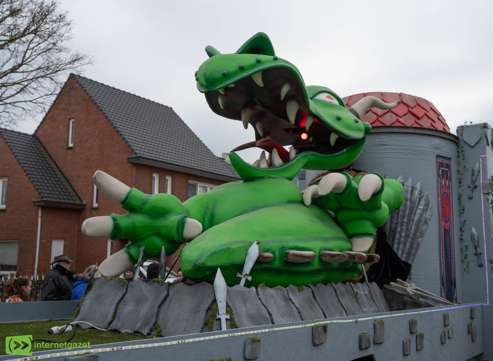 Na afloop wilden verschillende verenigingen doorsteken naar de Lichtstoet in Neerpelt, maar daar lag de sneeuw al centimeters dik. De Lommelse Party Jokers meldden af — hun draak (foto onder) had het te koud — en ook de Braspappies kozen ervoor om niet richting Pelt te glijden. Het was toen ongetwijfeld nog héél gezellig in Lommel.