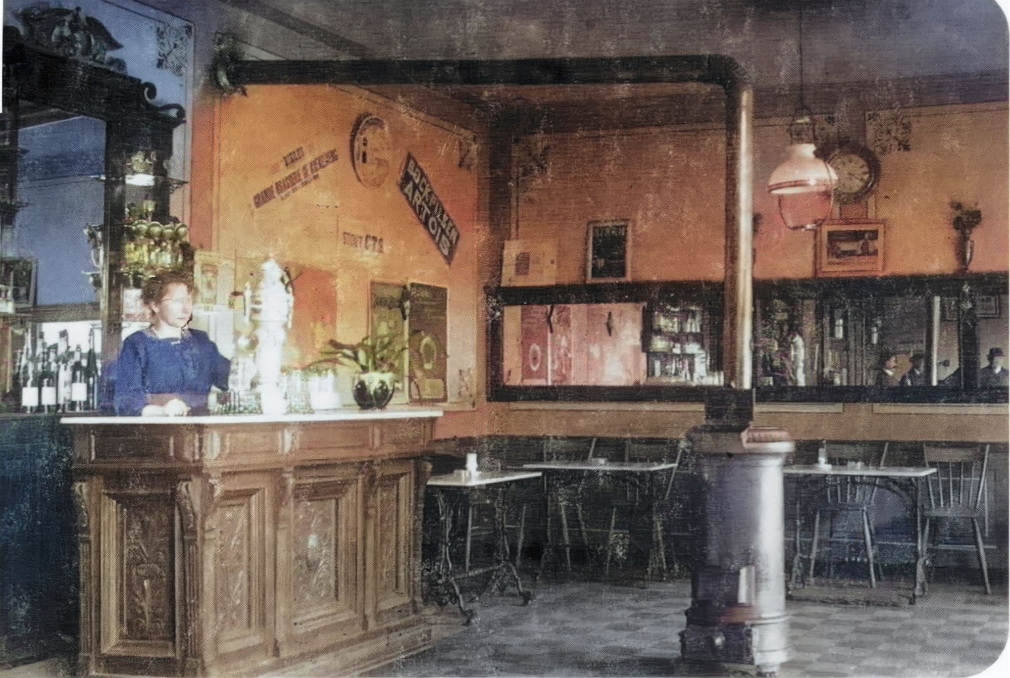 Hier vond men dan ook geen barkrukken aan de toog maar wel gietijzeren tafeltjes met marmeren blad om aan te gaan zitten. Voor de kenners: de reclame tegen de muur duidt ook aan dat hier het betere bier te drinken was.
