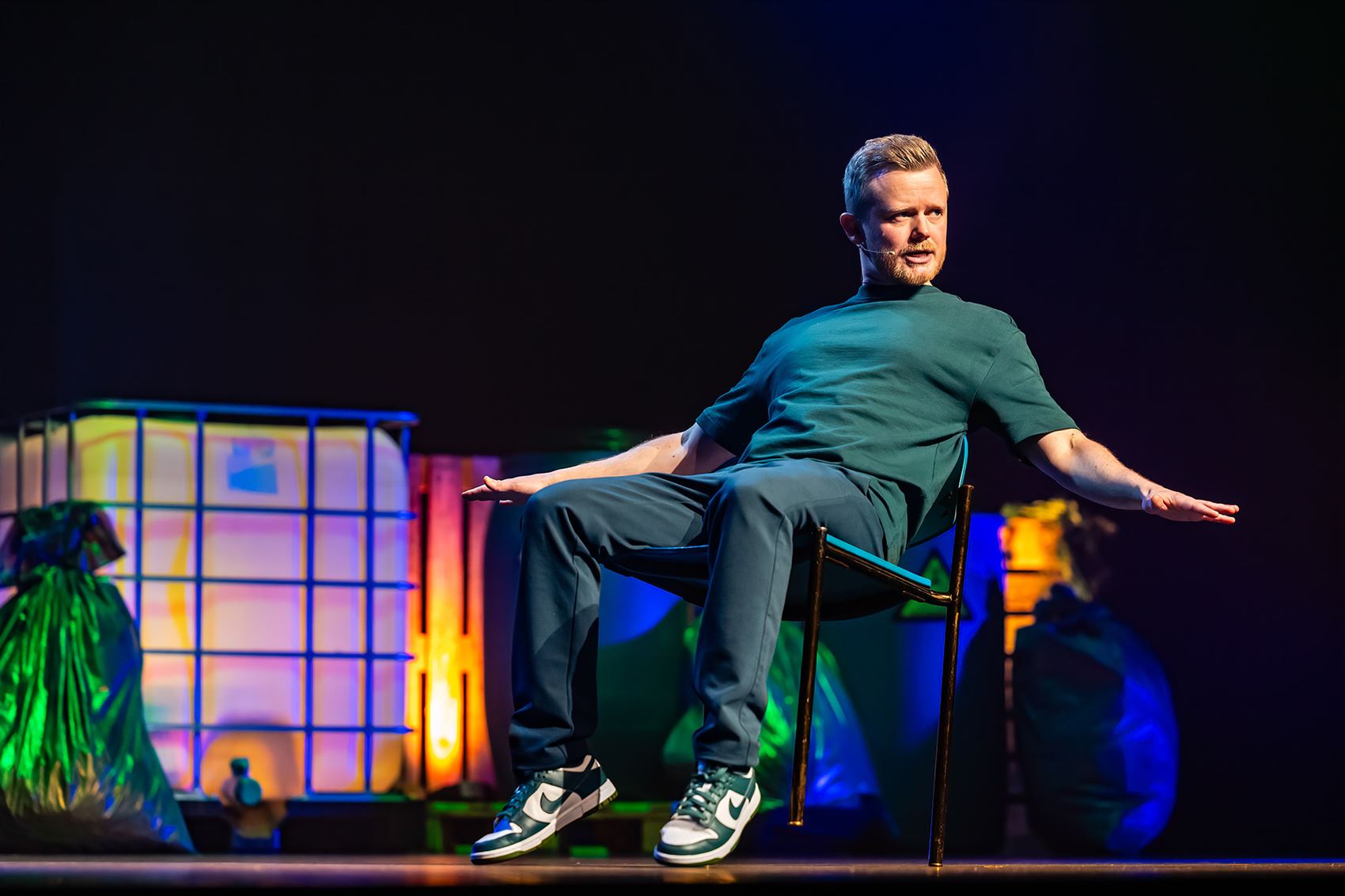 In Klein Gevaarlijk Afval neemt Verdick het publiek mee in zijn persoonlijke leven. Hij vertelt onder meer over zijn relatie met zijn plusdochter, zijn honden en zijn vriendin, die kampt met chronische migraine. Thema’s die niet altijd evident zijn, maar die hij met zijn kenmerkende humor en respectvolle insteek weet om te buigen tot een warme en herkenbare voorstelling. (Foto Dorien Goetschalckx)