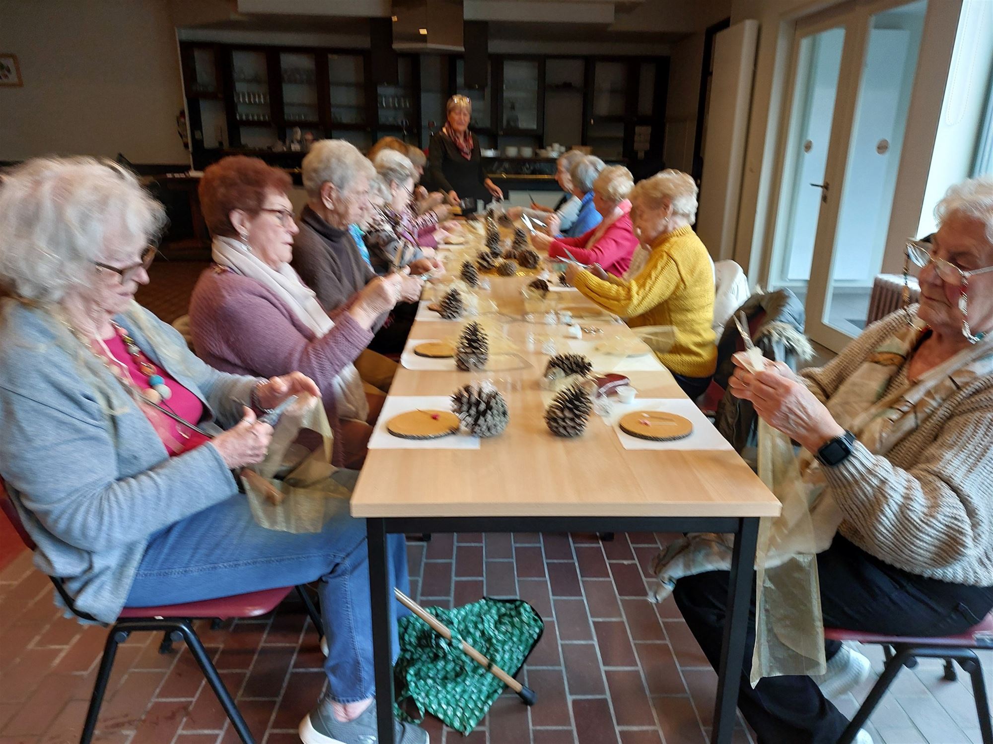 Samana Lommel-centrum samen in de Volksmacht. Terwijl de regen met bakken uit de hemel viel zaten ze gezellig samen te knutselen. Met fijne stoflapjes, kleine kersballetjes en andere mini kerst-attributen werd een kale dennenappel een prachtige
