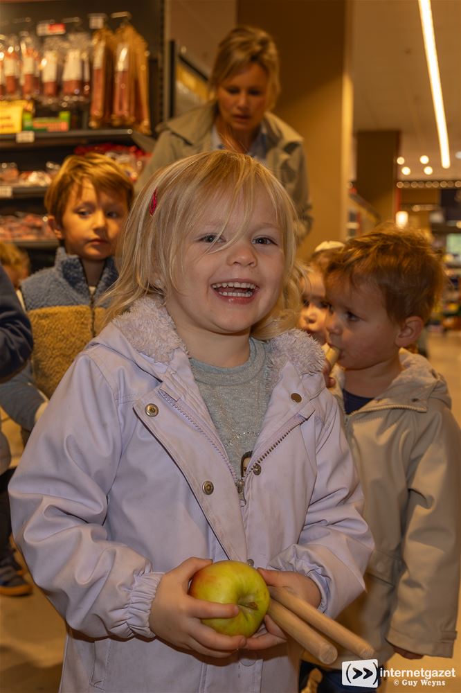 Ook bij de supermarkt konden ze het gebaar van de kleuters duidelijk waarderen. “De zang en glimlach van de kinderen maakten onze dag helemaal goed,” aldus winkelmanager Stefan Daems. Om hun waardering voor de school uit te drukken kregen alle kleuters nog een lekker appeltje. Bedankt!