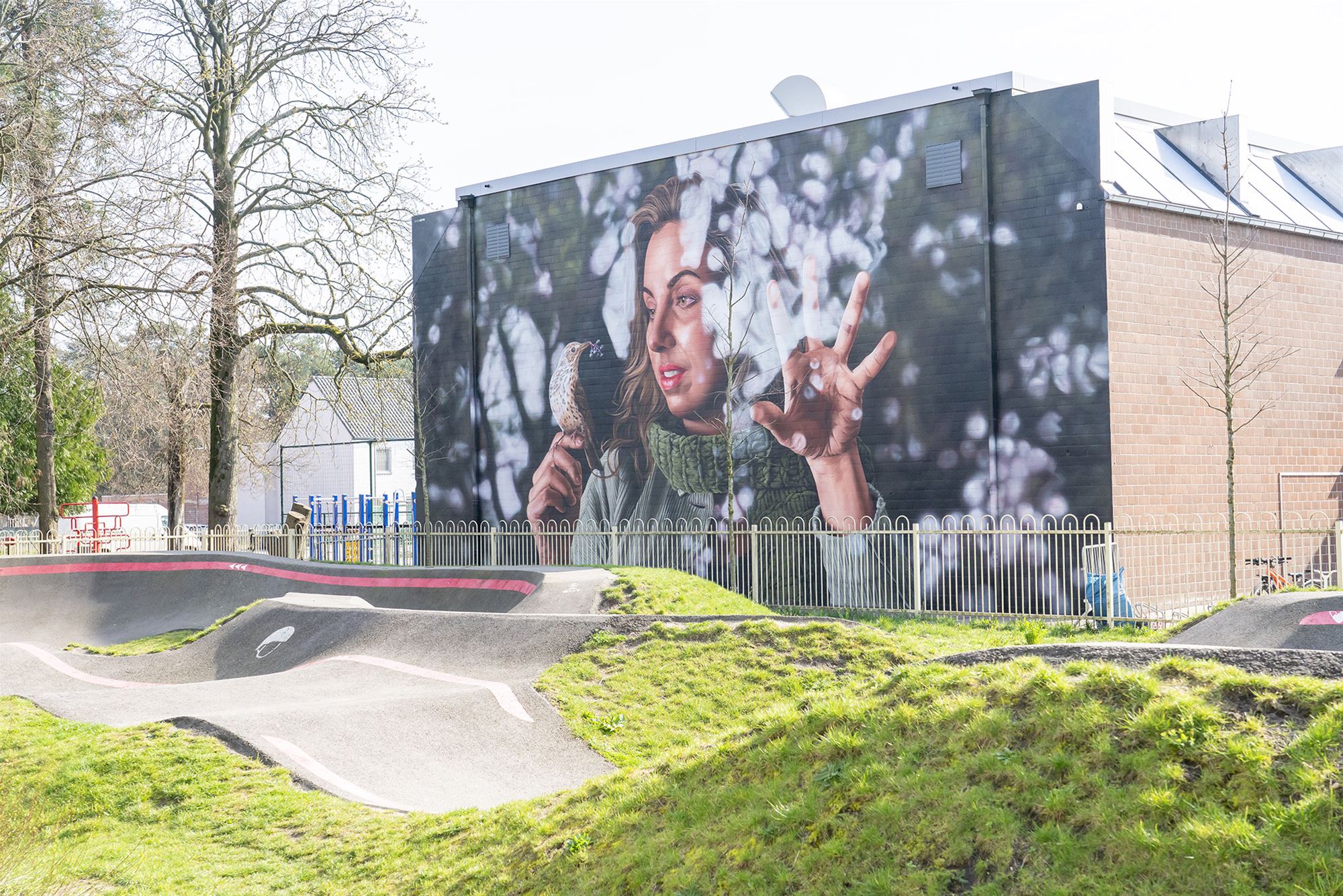 Centraal staat een vrouw achter subtiel glas, waarin een reflectie naar de Sahara verwijst. Op haar vinger zit een zanglijster, symbool voor de rijke cultuur en beleving in de buurt. Kleine details, zoals vlierbessen, vormen een knipoog naar lokale streekproducten en geven het geheel een extra laag betekenis.