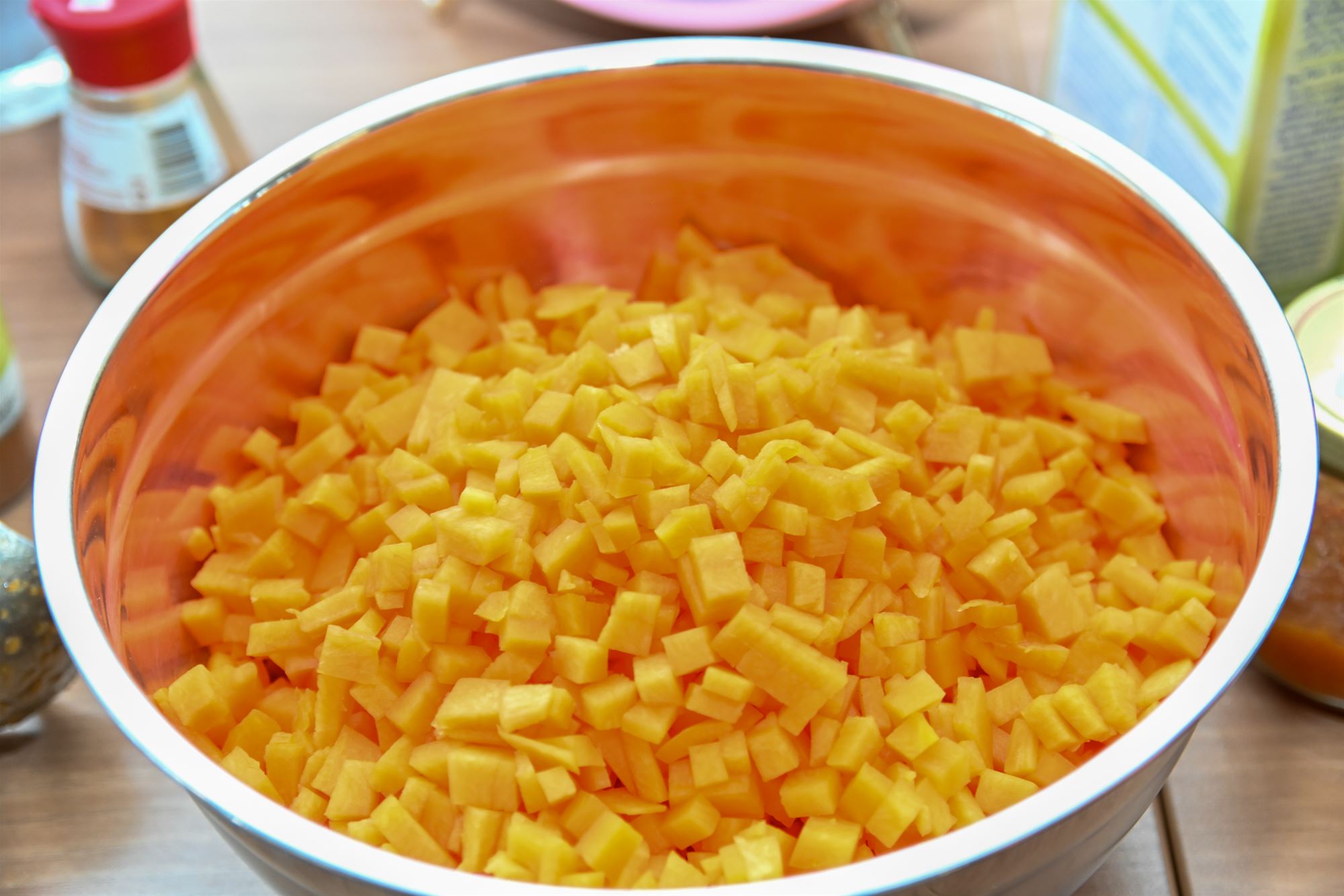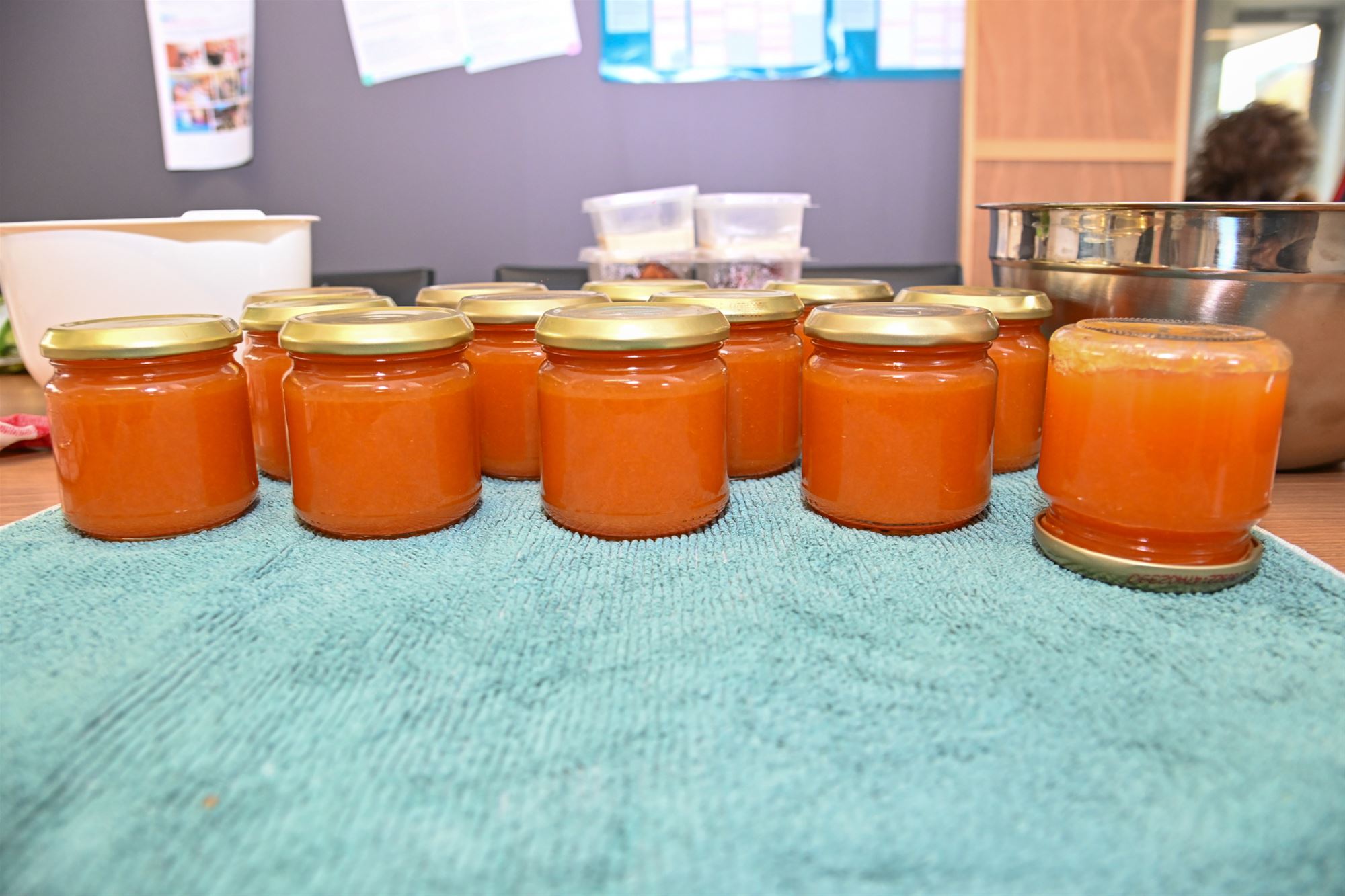 pompoenconfituur te maken. De pompoen werd in piepkleine blokjes van ongeveer een halve centimeter gesneden en vervolgens gekookt met appel, gember of kaneel. Daarna werd alles netjes in potjes verdeeld.