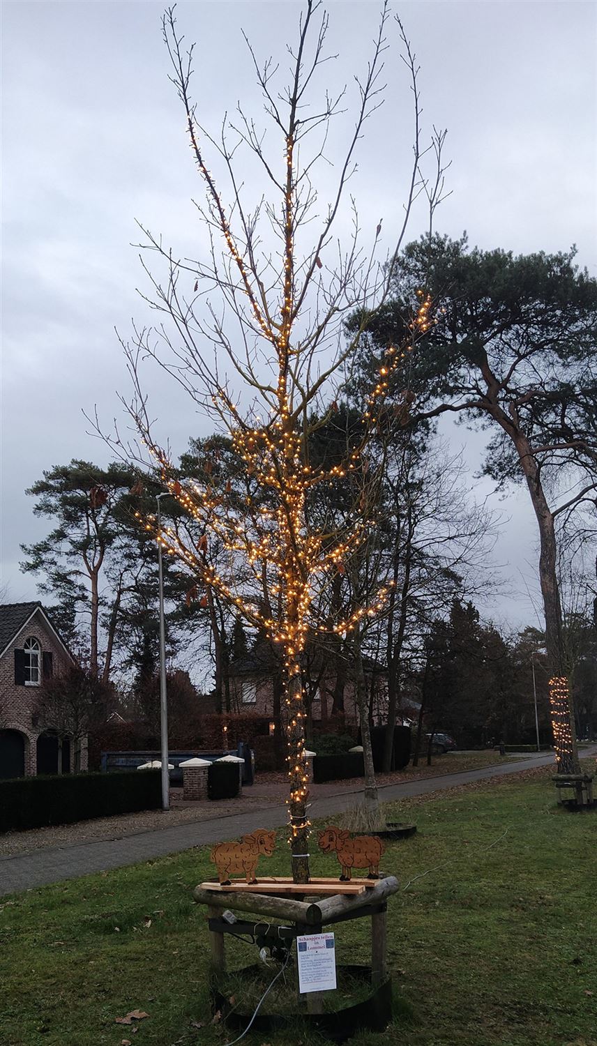 De schaapjes staan verspreid opgesteld rond een verlichte boom en vormen samen een vrolijk en speels tafereel dat jong en oud uitnodigt om even stil te staan.