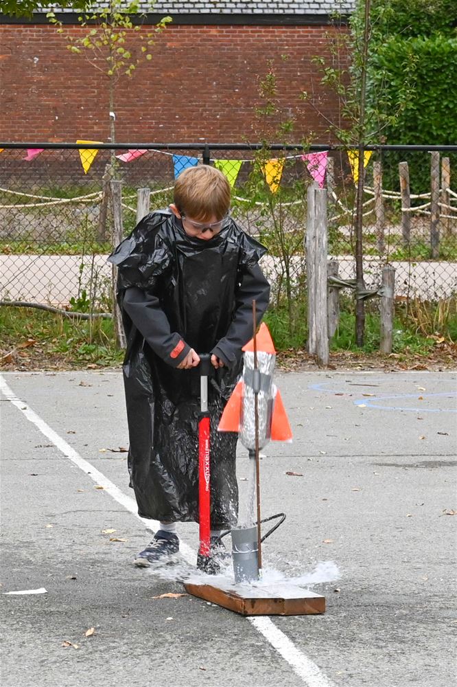 raket, die later tijdens de veiling verkocht werd. Oud-leerling Sam Vandervee kon deze voor 22 euro in de wacht slepen. Ondertussen lanceerden enkele leerlingen trots hun zelfgemaakte kleine raketten, wat zorgde voor luid applaus op de speelplaats.