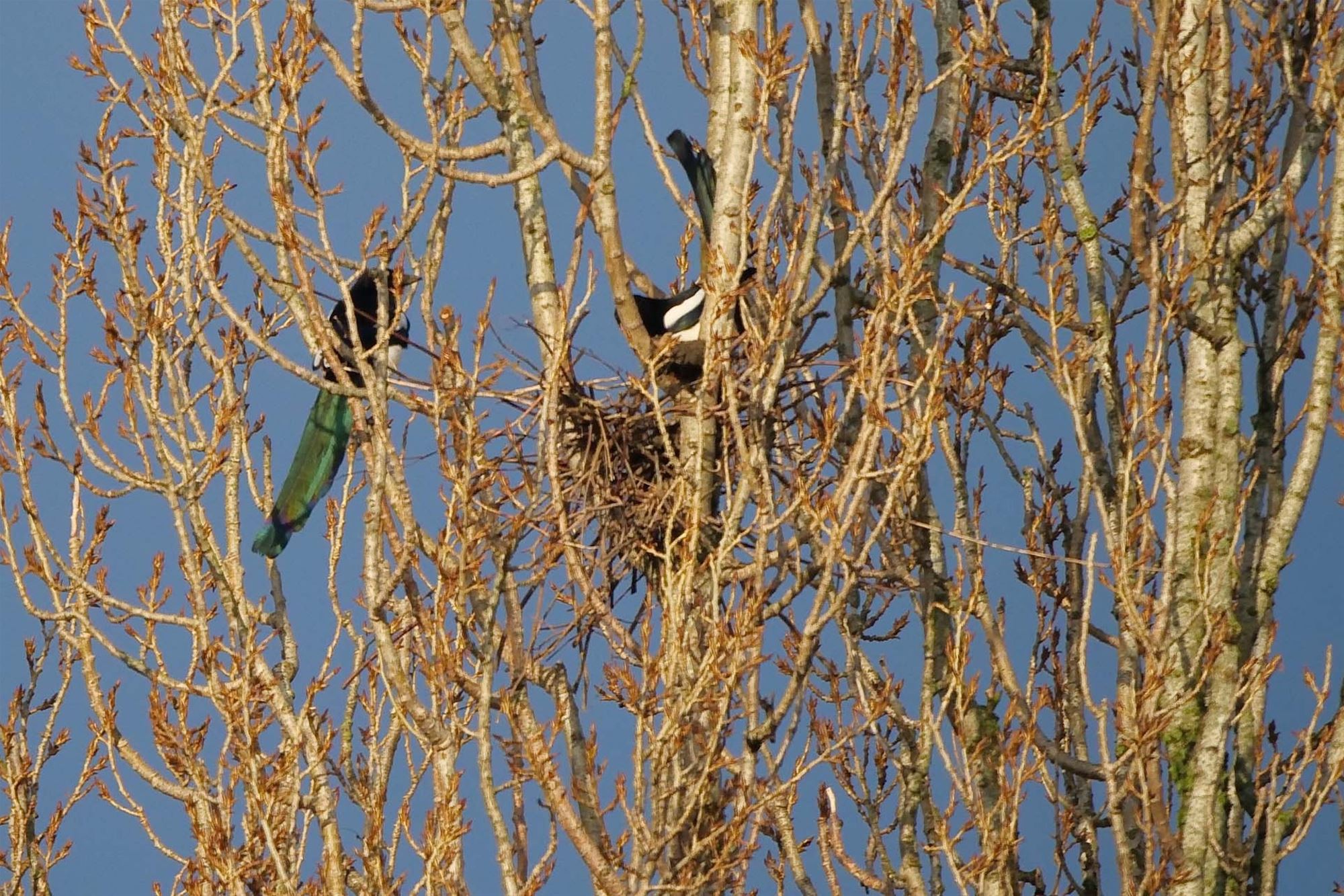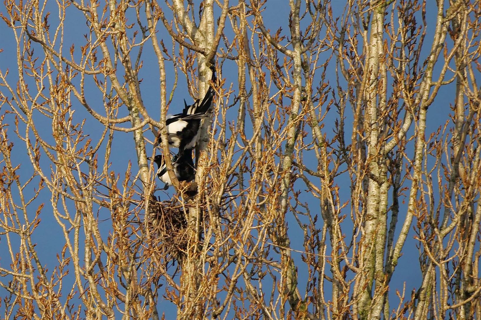 Bij deze eksters kriebelt de lente al en ze zijn hun nestje al aan het bouwen.