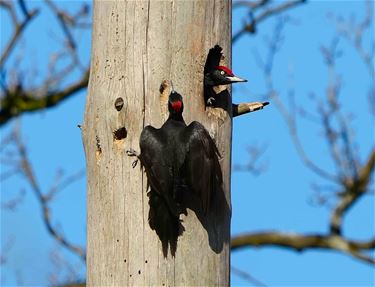 Maar je hoort natuurlijk niet alleen vogels die terugkeren uit warmere gebieden. Vorige week was mijn verbazing dan ook groot dat ik plots de luide roep van de zwarte specht hoorde. Mijn verbazing was uiteindelijk nog groter toen ik hem zag aangevlogen komen, gevolgd door het vrouwtje. En wat natuurlijk nog mooier werd was het feit dat ze landden vlak bij het wandelpad tegen een dorre boom. De gaten in de boom werden grondig geinspecteerd en uitgetest. Prachtig om te zien hoe ze beiden het grote gat in de boom uitprobeerden.