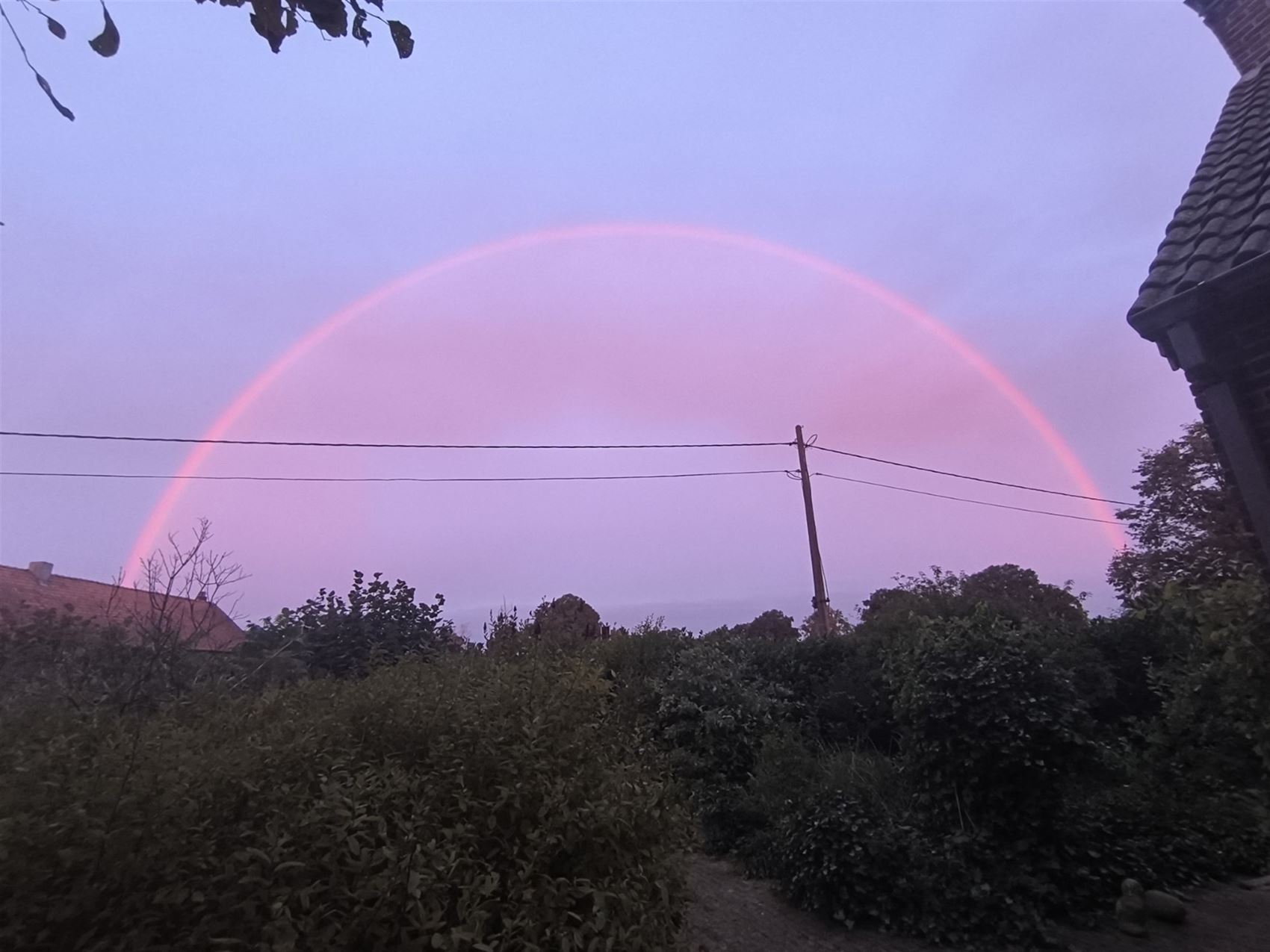 Deze ochtend leverde de zonsopkomst niet alleen een prachtig oranjerood kleurenspel op de horizon op. Wie zich even omdraaide, kon nog iets bijzonderder zien: geen klassieke regenboog, maar toch duidelijk een