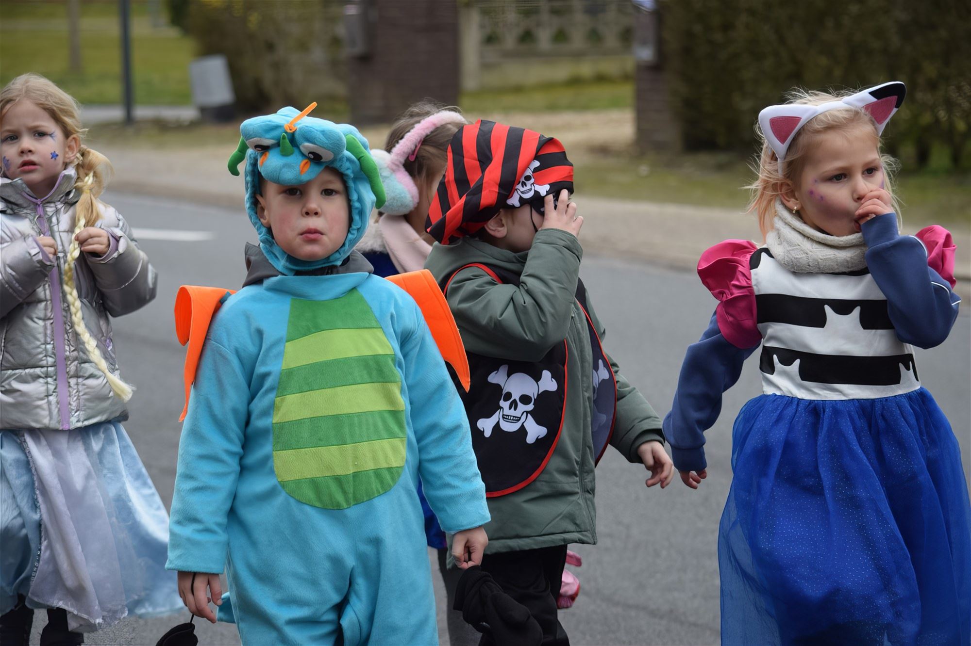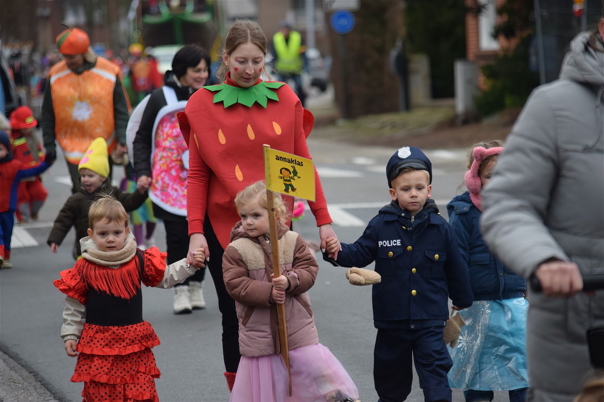 Buurtbewoners kwamen nieuwsgierig naar buiten om het kleurrijke schouwspel te bewonderen. De sfeer zat er goed in en er werd enthousiast gezwaaid en meegezongen.