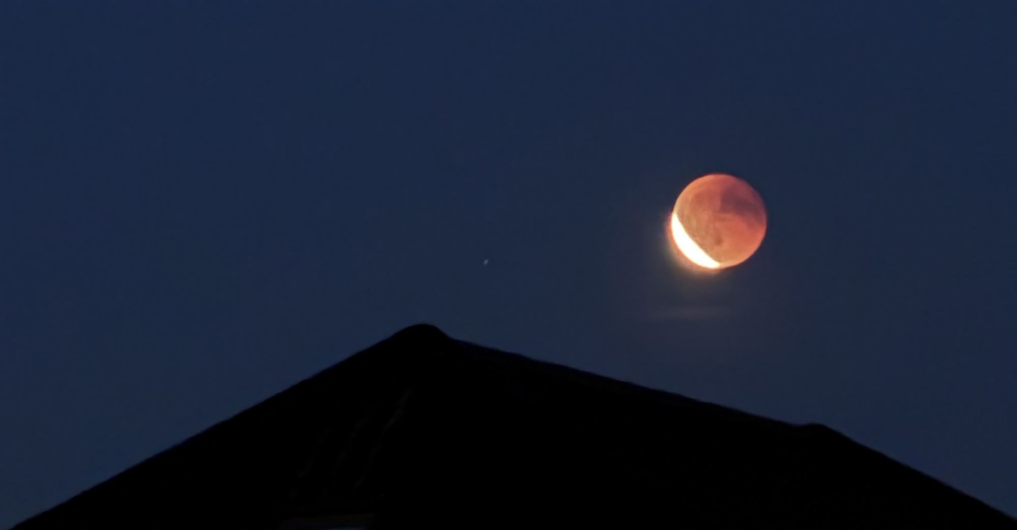 De maan blijft iets mythisch hebben, zoveel is zeker. Ook vanavond trokken weer heel wat nieuwsgierigen naar hogere uitkijkpunten, zoals de brug over het kanaal, om de aangekondigde bloedmaan te bewonderen. Alleen: rond 20.11 uur verscheen ze niet zoals voorspeld. Wie geduld had, kreeg een halfuurtje later wel een glimp te zien, al was de kleur veel minder rood dan verwacht. Boven de Kerkstraat was de verduistering goed zichtbaar, maar die ging grotendeels voorbij aan de meeste terrasjesgangers. (Foto's Marc Faes) Ook boven de Grote Heide werd uitgekeken naar de bloedmaan, dat deed ook Loes Verweyen die de foto onder (2e rij) maakte.