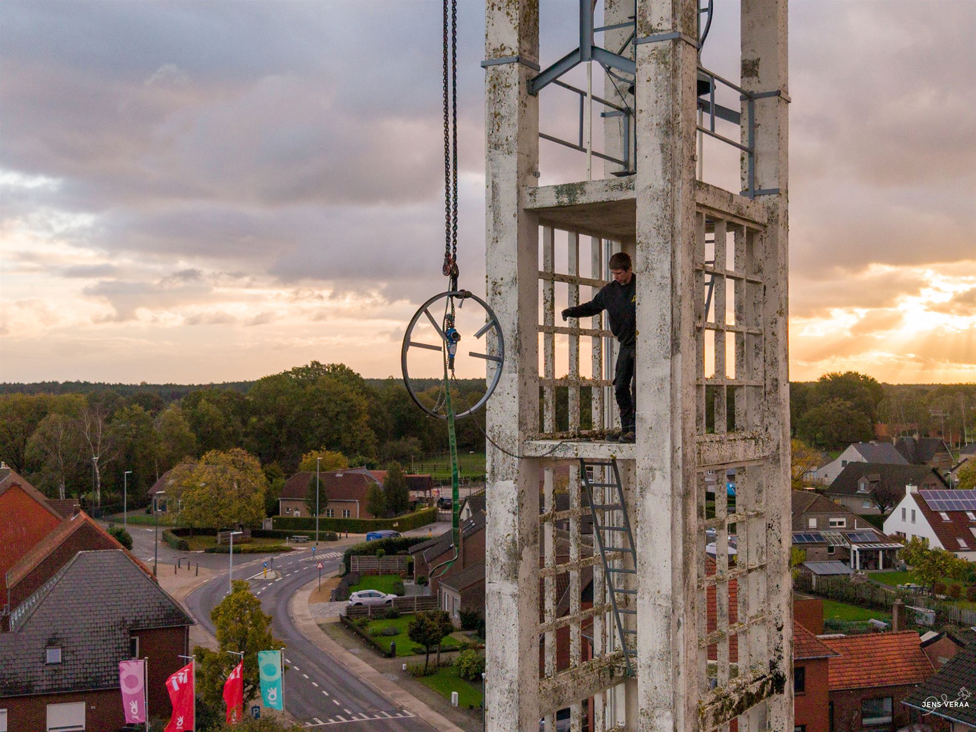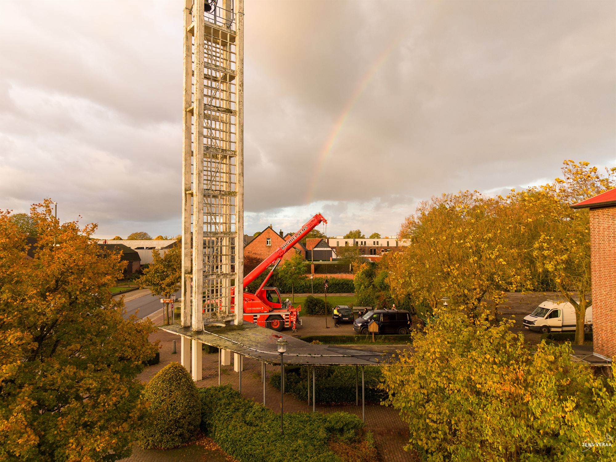 weghalen van de kleine klok bij te wonen. Want wat bleek: de klok was… al weg! De verbazing werd nog groter toen een grote kraanwagen arriveerde en de machinist zich afvroeg waar die bewuste klok was die hij naar beneden moest halen.
