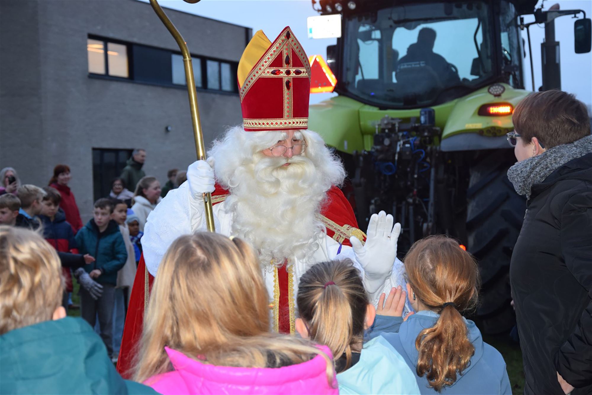 tractor reed hij de speelplaats op, waar hij hartelijk werd begroet door de enthousiaste kinderen. Daarna bezocht hij de kleuterklassen, waar de allerkleinsten hem verrasten met prachtige Sinterklaasliedjes. Ook bij de oudere leerlingen ging hij langs. Zij trakteerden de Sint op mooie gedichten en leuke optredens.