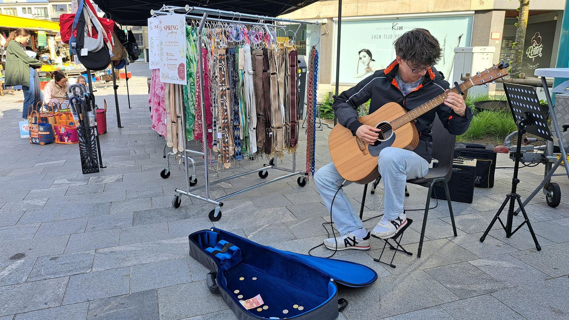 Arne voor een fijne muzikale sfeer met zijn gitaar. Het werd zo een bijzonder gezellige voormiddag op de markt.