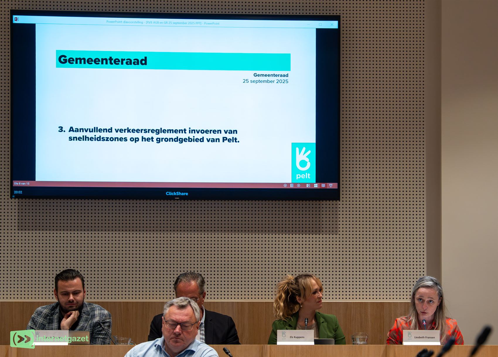 Liesbeth Fransen tijdens de recente gemeenteraad haar voorstel aan om van heel Pelt een zone 50 te maken, met twee uitzonderingen: de dorpskernen blijven of worden zone 30, en een beperkt aantal delen van gewest- en grote verbindingswegen blijven zone 70. Op vrijdag publiceerden we hieromtrent al de