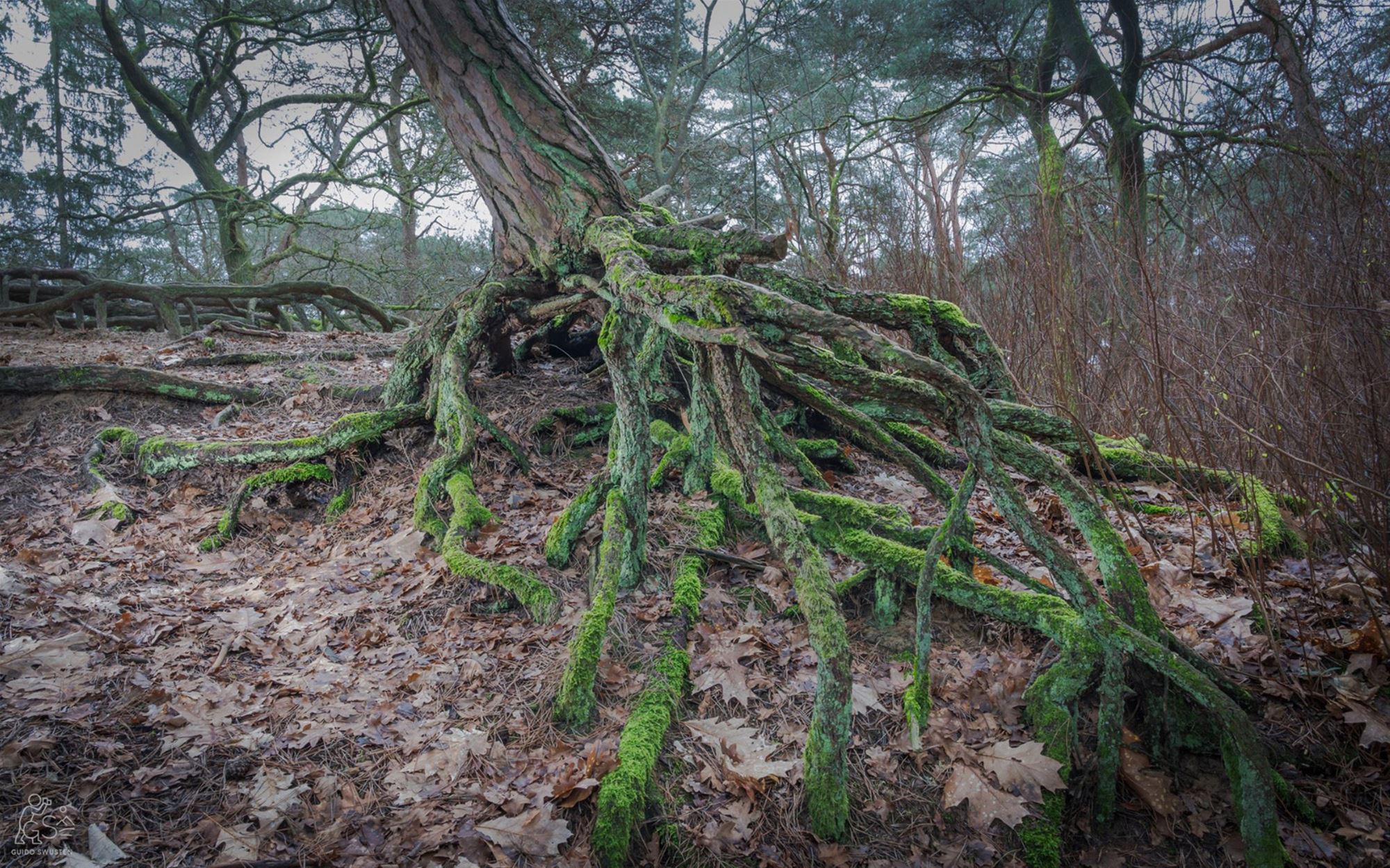 kabouterwoningen. De wind zou de grond hebben weggeblazen om hun geheime schuilplaatsen bloot te leggen — compleet met natuurlijke deurtjes en raampjes. Ik heb nauwkeurig gezocht in het park van het