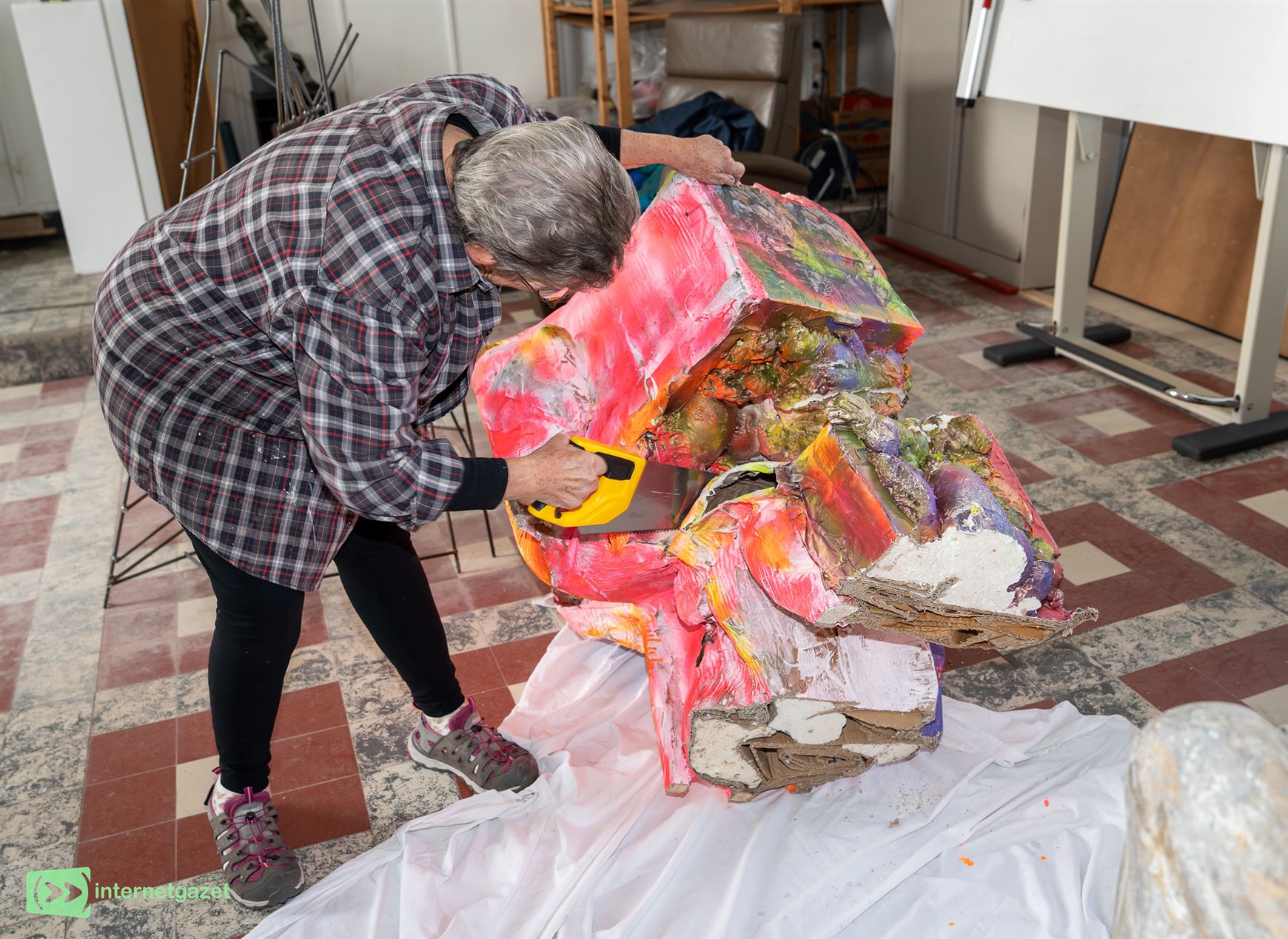 Lieve Parein wel — op zoek naar een “zaag”, naar eigen zeggen. Op het eerste gezicht wat verrassend, maar ze gebruikt het gereedschap om haar kunstwerken te recycleren.