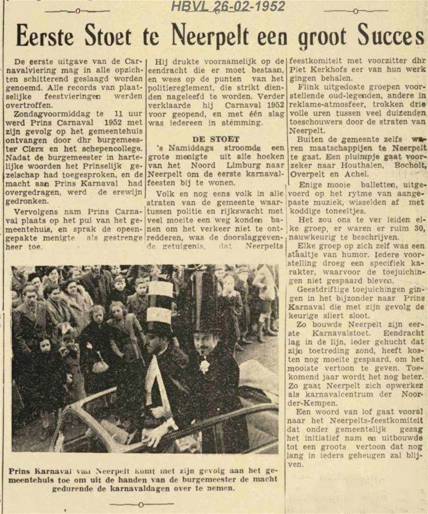 1952 trok voor het eerst een echte karnavalstoet door Neerpelt. Daarmee schaarde het dorp zich naast grotere Limburgse steden als Hasselt, Tongeren, Maaseik, Sint-Truiden en Borgloon, waar carnaval al langer een vaste traditie was. Ook in het noorden van de provincie kwam er voortaan een kleurrijke optocht: De