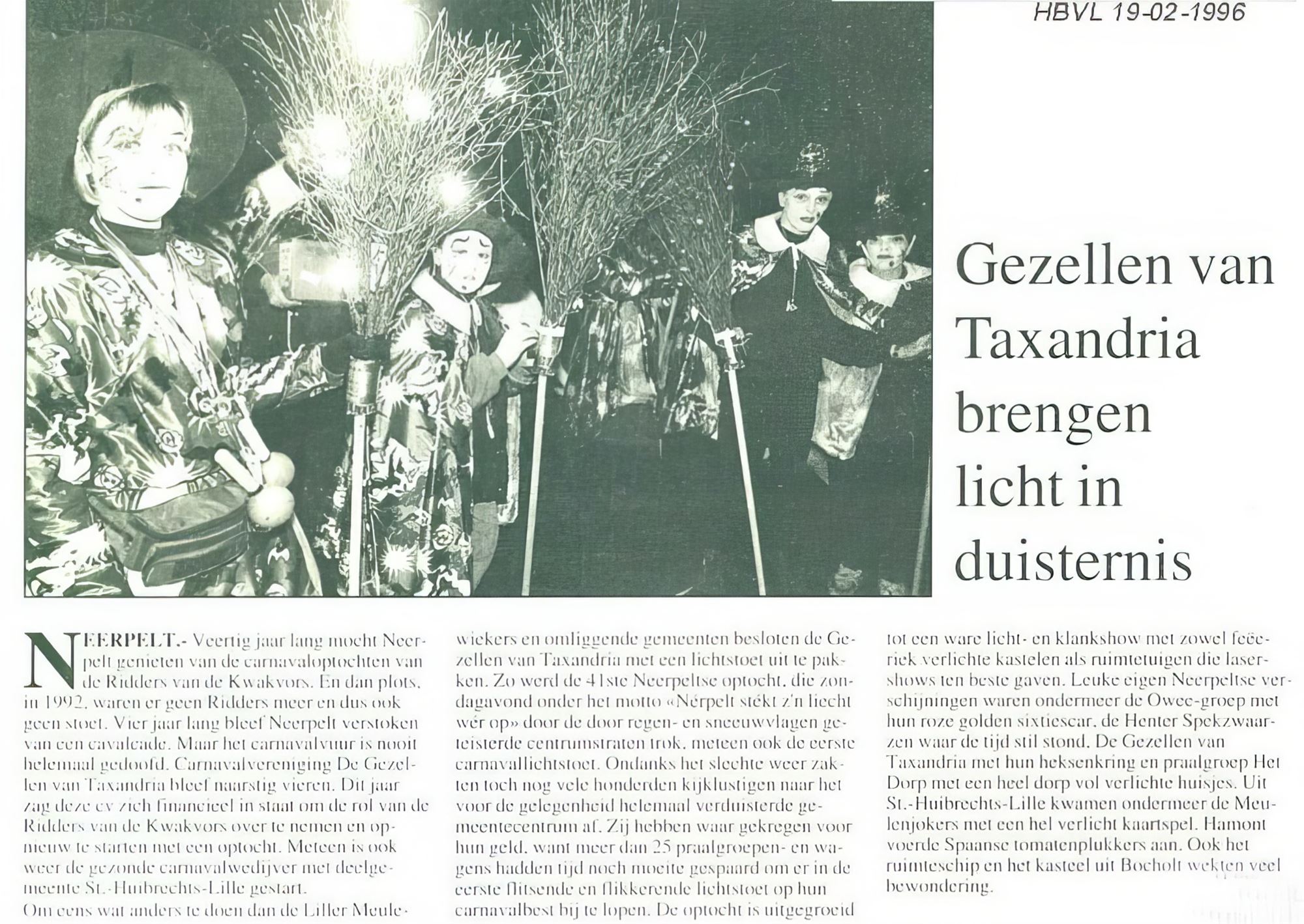 Toch betekende dat geen definitief einde van het Neerpelts carnaval. In 1996 namen de Gezellen van Taxandria het voortouw met een nieuw concept: de lichtstoet. Die bleek meteen een schot in de roos. Wat startte als een frisse herneming, groeide uit tot een vaste waarde die vandaag al aan zijn 31ste jaargang toe is.