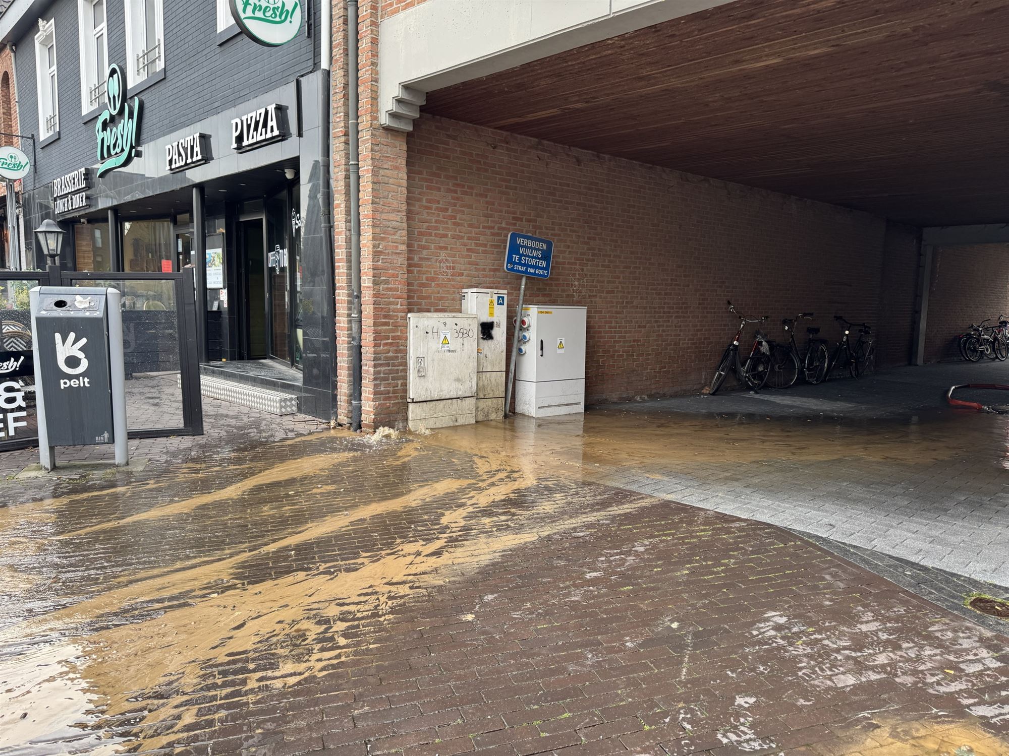 Dorpsstraat in Overpelt, ter hoogte van de Oude Markt, is deze voormiddag een ondergronds waterlek vastgesteld. Het lek zorgde ervoor dat verschillende kelders in de omgeving onder water liepen.