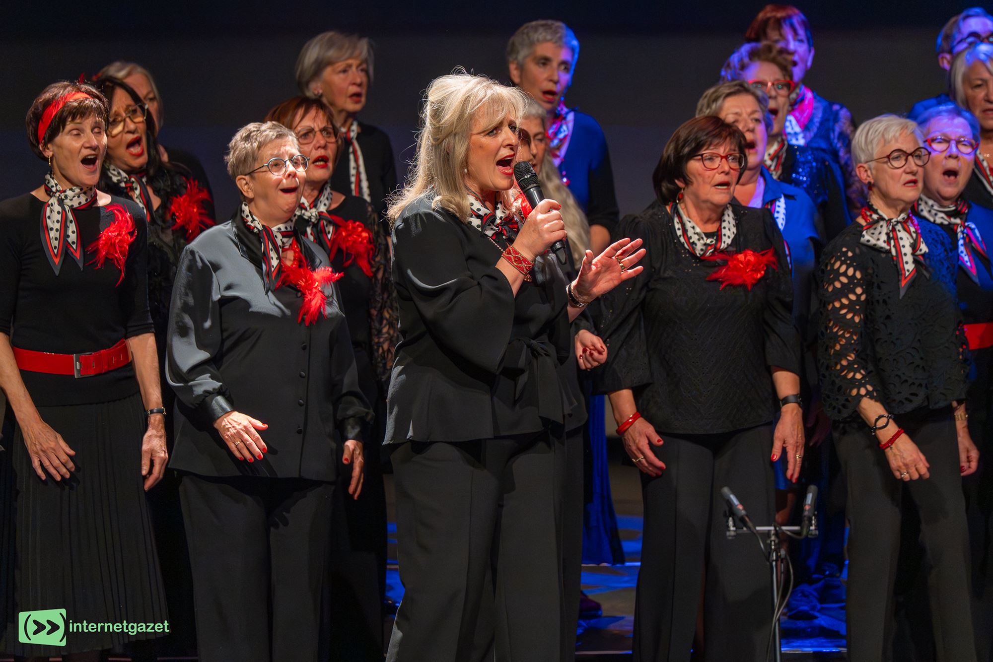 Meer foto'sNa een eerder ingetogen eerste deel werden de toeschouwers de pauze ingestuurd met het vrolijk meezingbare Top of the World van de Carpenters – meteen een voorproefje van het swingende tweede deel. Toen al was duidelijk dat dirigente Lut Dreesen, die het koor pas in mei overnam na het onverwachte uitvallen van voorganger Paulus vanden Bemt, het gezelschap grondig naar haar hand had weten te zetten.