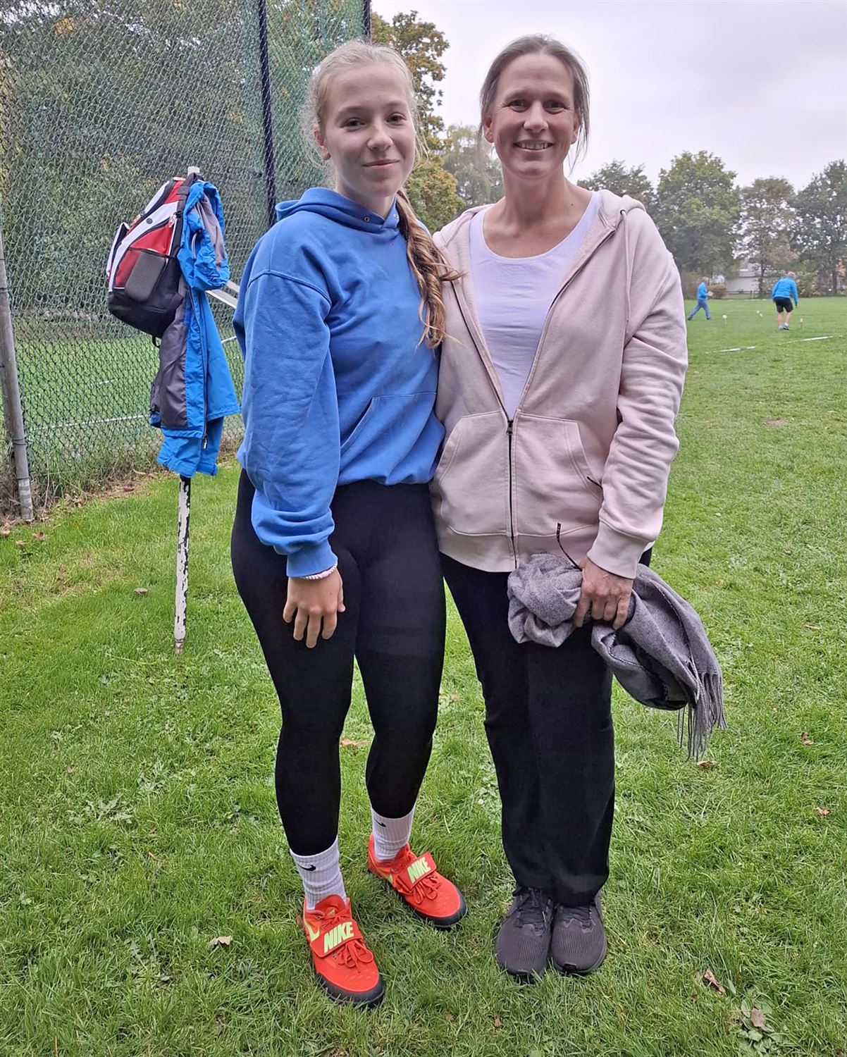 Het vorige record hield maar liefst 38 jaar stand. Lou’s worp leverde haar bovendien de beste Belgische jaarprestatie bij de kadetten meisjes op – een prachtige afsluiter van het atletiekseizoen voor de jonge Peltse atlete. (Foto: Els Libbrecht en Lou Schildermans, oud en nieuw clubrecordhoudster discuswerpen bij SACN)