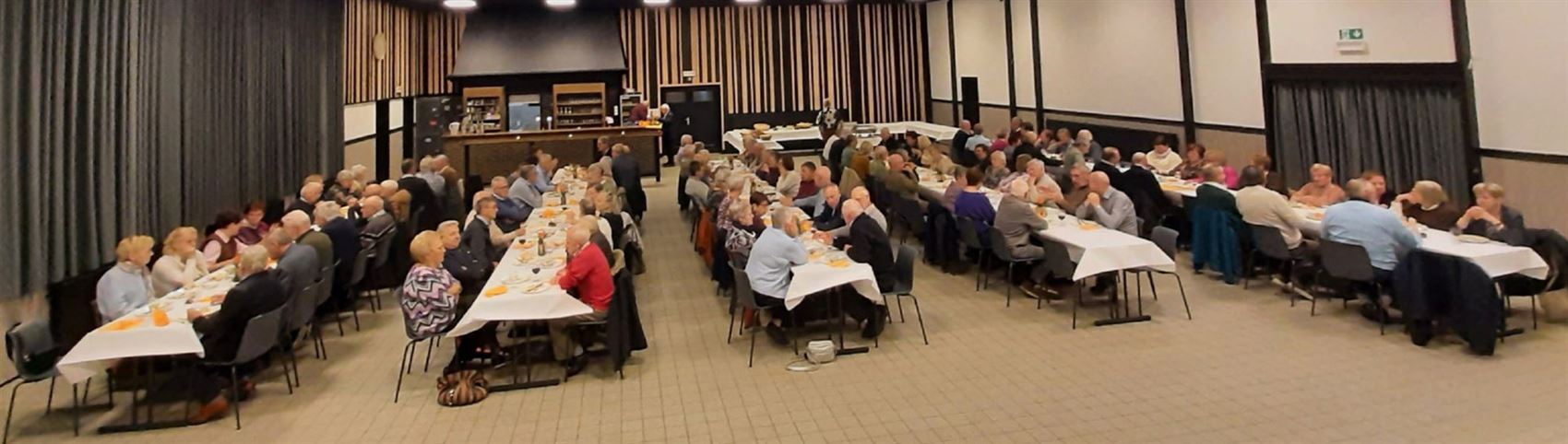 120 tuinhierders uit Pelt en omgeving hun jaarlijks feest. In de zaal op het