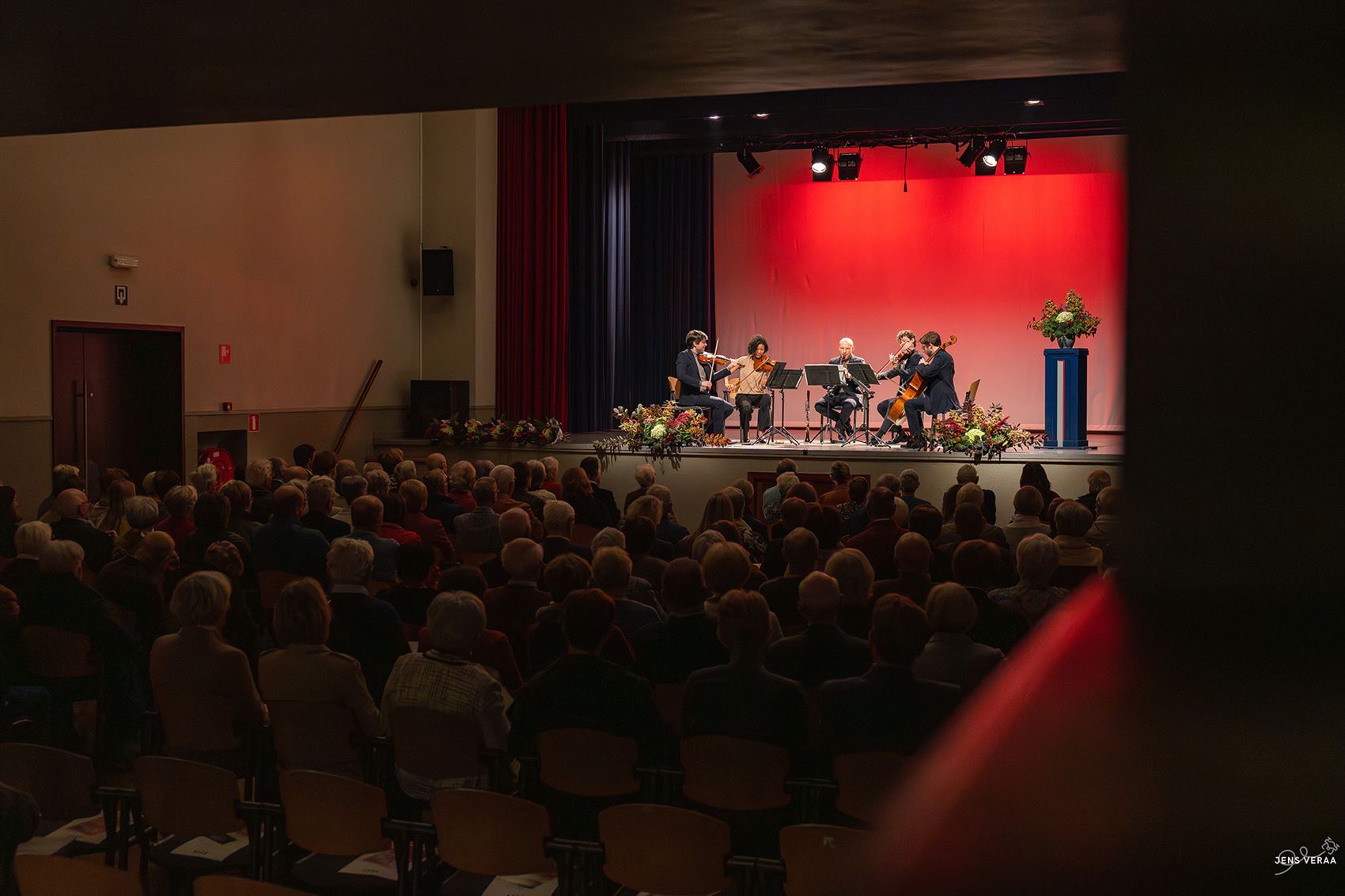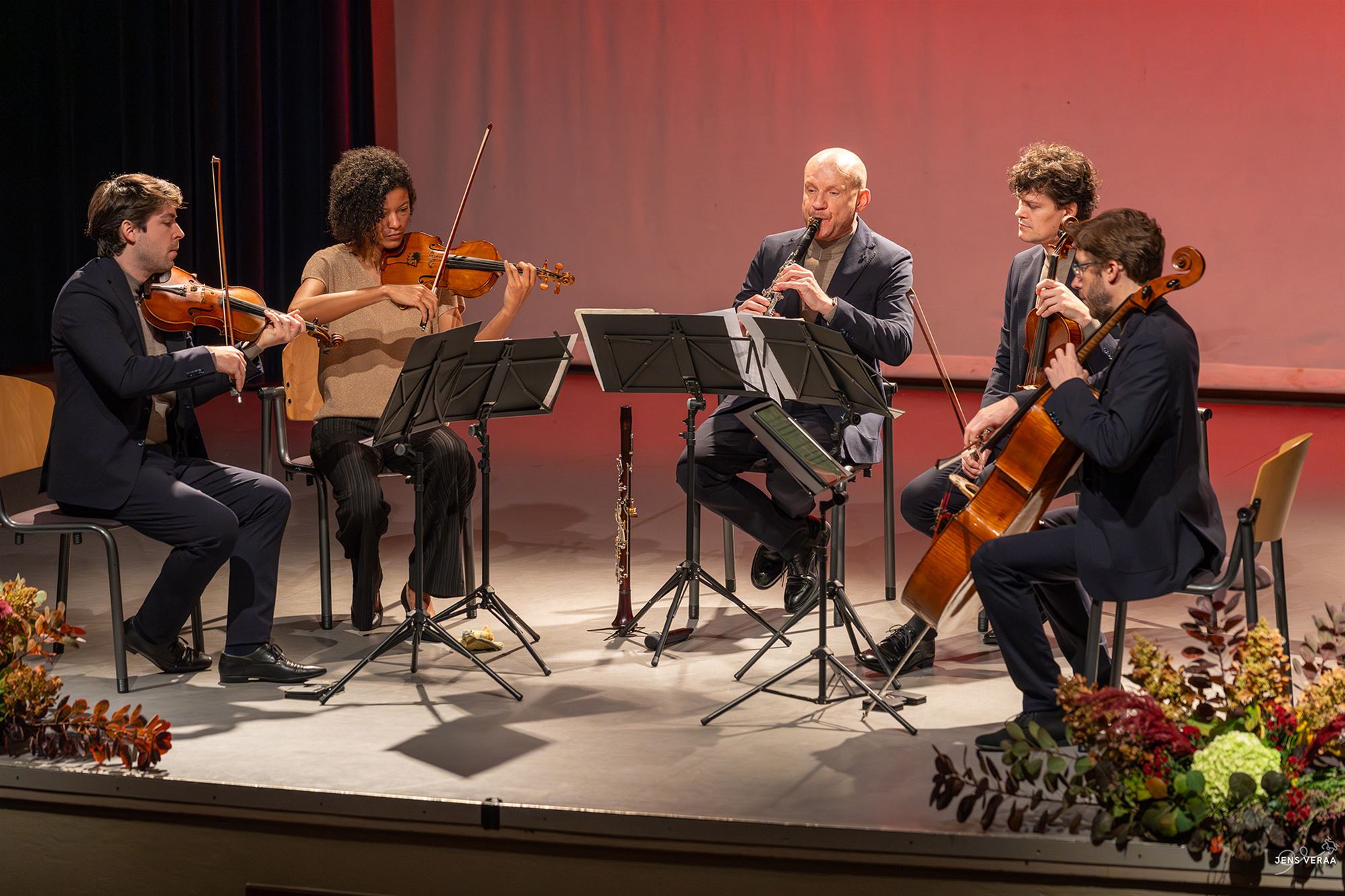 Vier bevlogen topmuzikanten — Roeland Hendrikx (klarinet), Nicolas Dupont en Noémi Tiercet (violen), Sander Geerts (altviool) en Sébastien Walnier (cello) — zorgden voor een warme en meeslepende start van het feestelijk jaar.