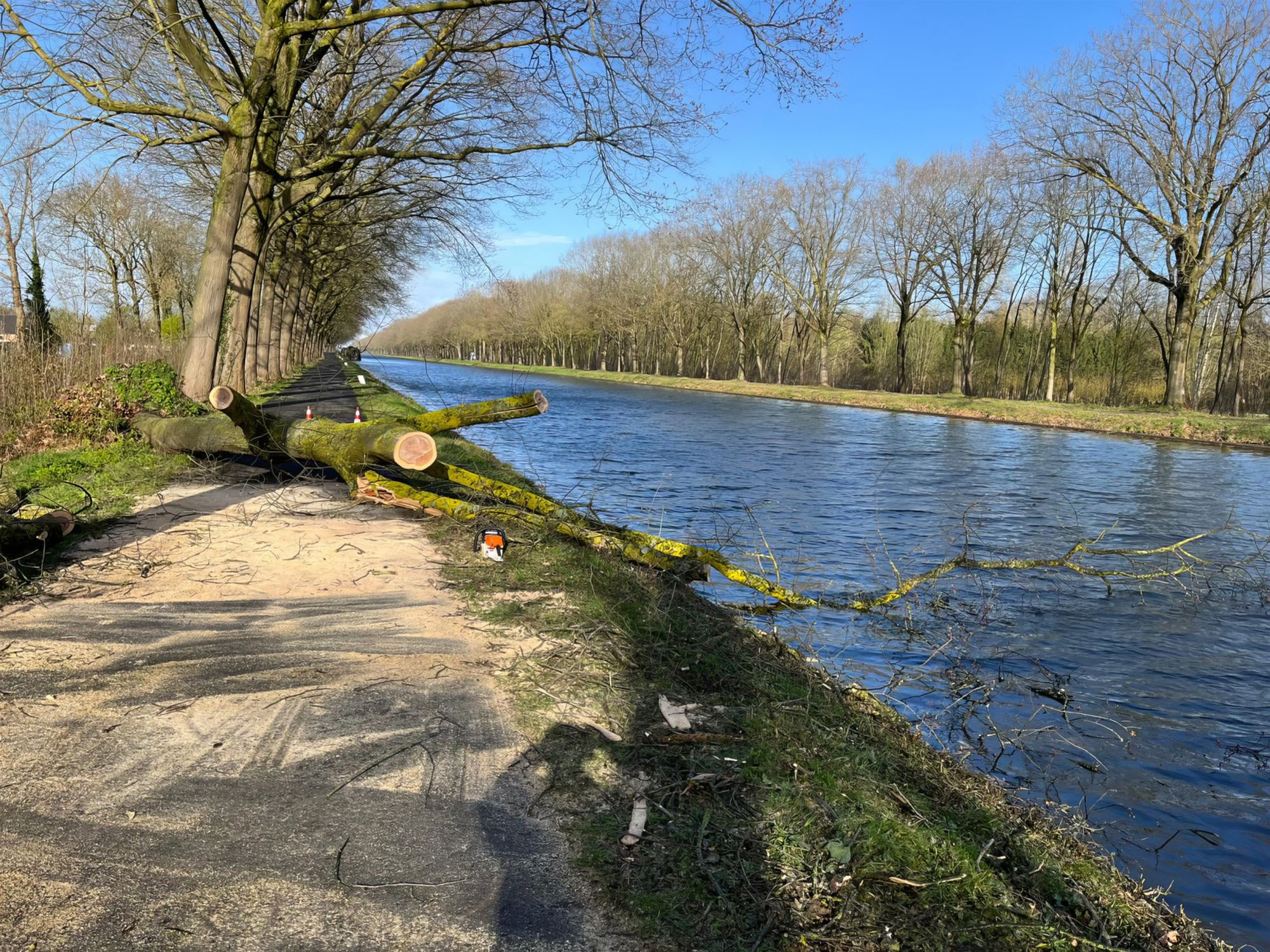 Langs het kanaal was de impact nog duidelijker. Daar begaf een grote boom het onder het natuurgeweld en kwam die terecht op het jaagpad. Dat ondervond ook