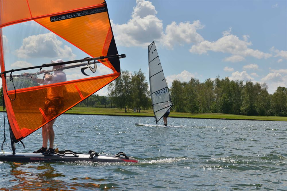 surfclub Sirocco vandaag een eerste wedstrijd. En daar hadden de leden en bezoekers fel naar uitgekeken na een lange periode in isolatie door corona. Wedstrijdsurfen is vergelijkbaar met een zeilwedstrijd. De voorrangsregels zijn identiek en de bedoeling is om zo snel mogelijk een parcours af te leggen door een aantal boeien in de juiste richting te ronden om dan aan te komen tussen twee aankomstboeien. "De voormiddag waaide de wind matig uit het zuiden en was daardoor niet constant. De wind komt dan immers over het golfterrein, met de nodige begroeiing, voor die het water bereikt. Peter Wauters en Jan de Muyer namen elk een manche voor hun rekening.