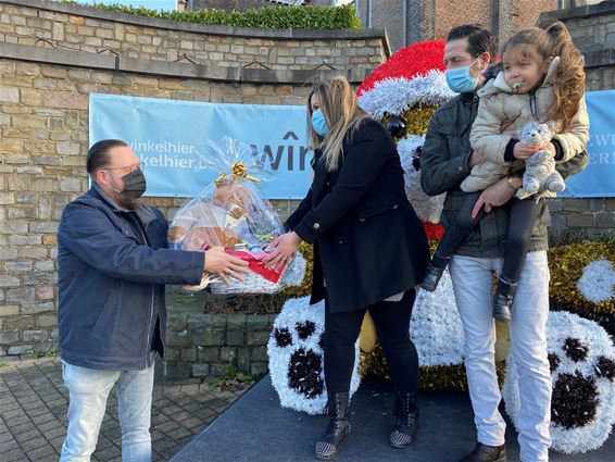 Het hoogtepunt van de prijzenactie vond echter afgelopen week plaats toen de hoofdwinnaar gekozen werd uit de mensen die een foto van zichzelf met alle 5 beren bezorgden. Schepen Janssen overhandigde vandaag persoonlijk, én helemaal coronaproof, een cadeaumand ter waarde van 100 euro aan