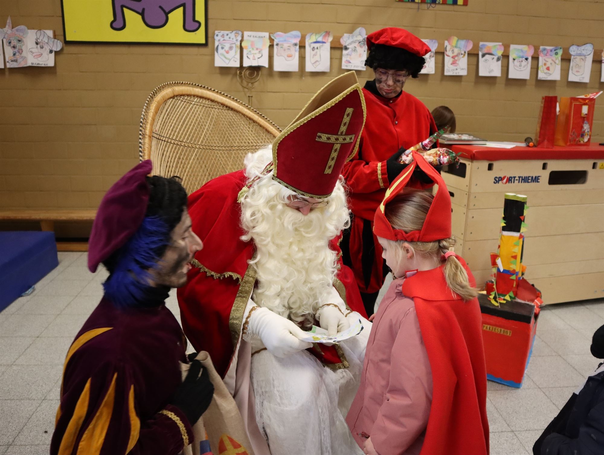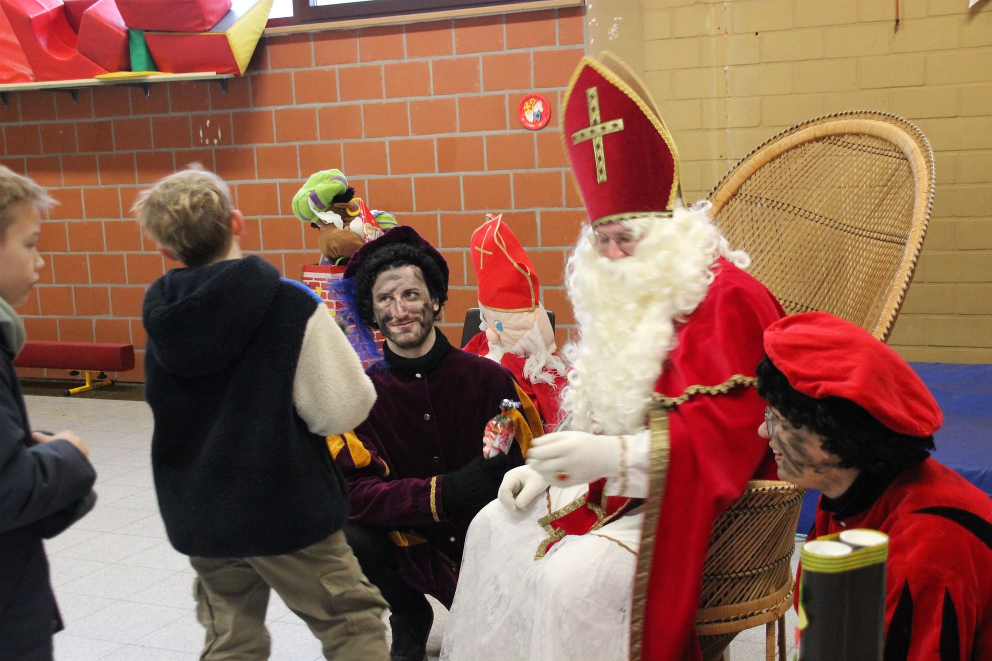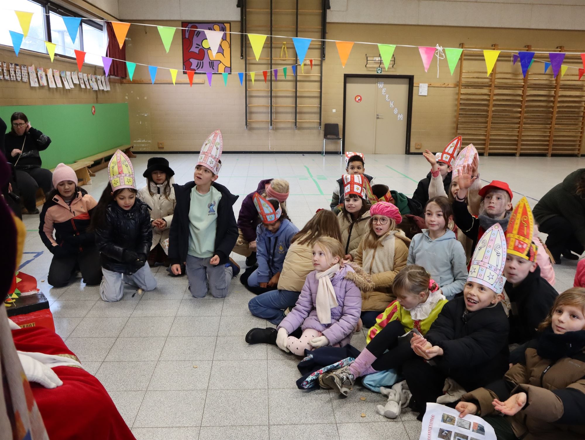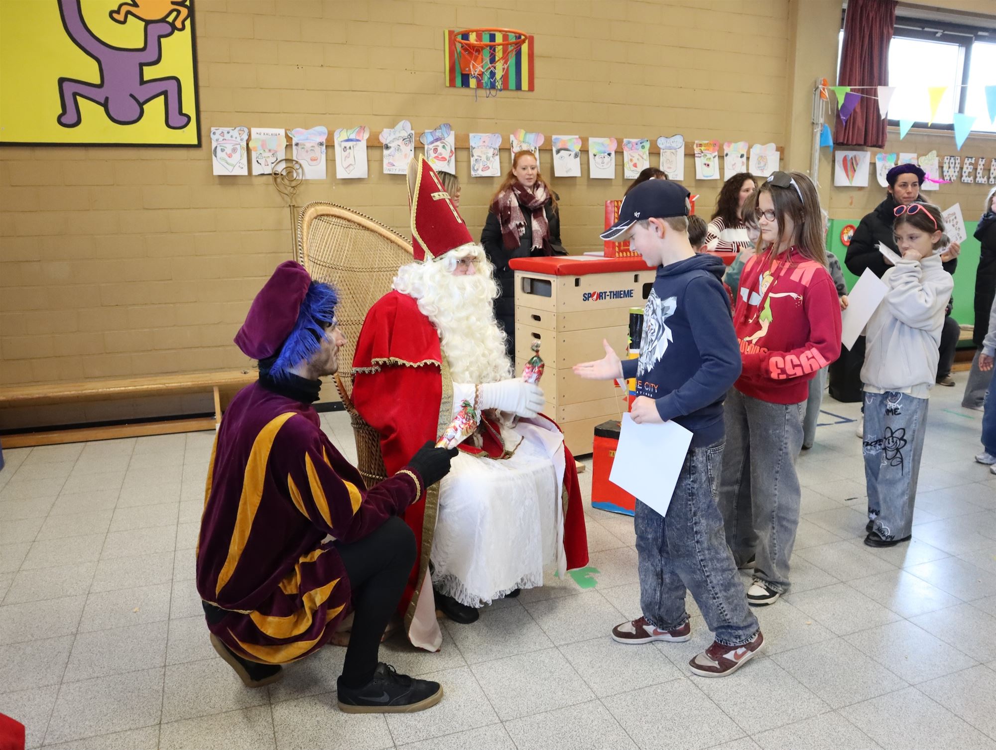 Daar werd het een leuke ontmoeting en ontving ieder kind een 'Pietendiploma' en een lekkere snoepzak. Op het einde van de schooldag werd de Sint en Piet enthousiast uitgewuifd.