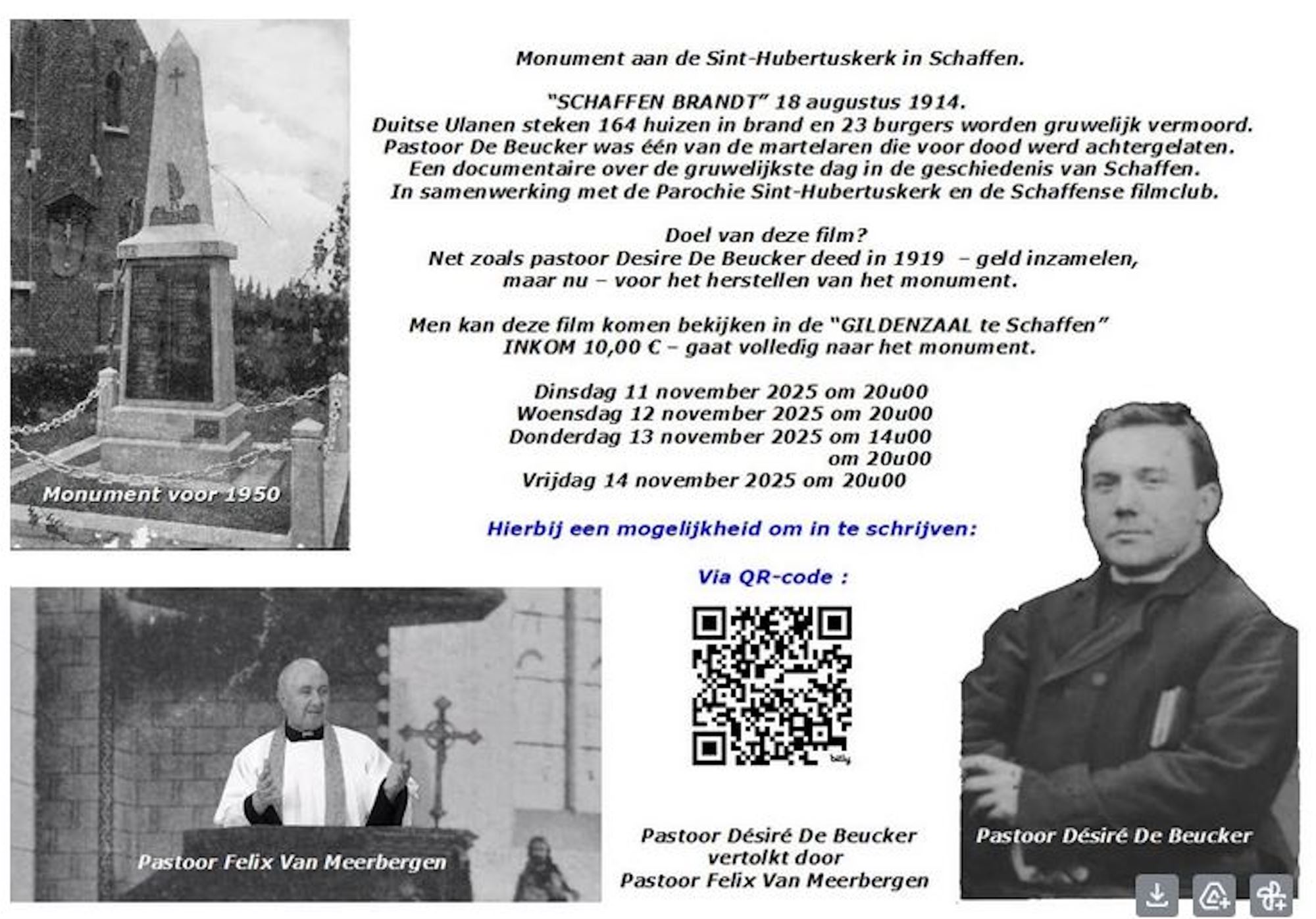De Schaffense filmclub heeft een documentaire gemaakt over de gruwelijke gebeurtenissen die zich voordeden te Schaffen op 18 augustus 1914. Op 28 juni 1914 worden keizer Ferdinand en zijn vrouw Sophie, tijdens een bezoek aan Sarajevo, dood geschoten door een aanhanger van de in Bosnië-Herzegovina opgerichte organisatie De Zwarte Hand. Deze aanslag wordt de aanzet van Eerste Wereldoorlog die uitbreekt begin augustus 1914.