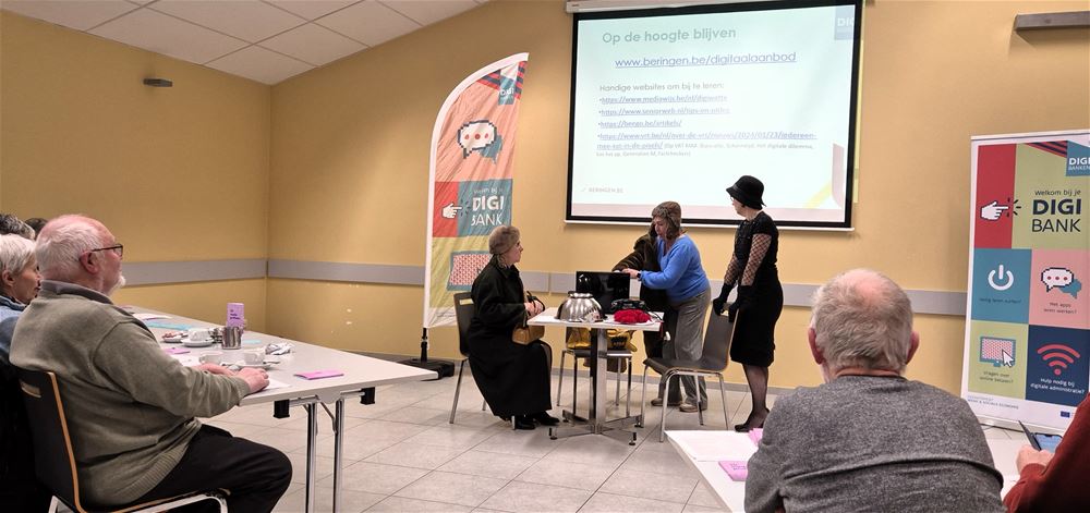 Deze eerste avond werd een infosessie. "Eerst werd uitgelegd wat Digibank Beringen eigenlijk is en hoe we in de verschillende digipunten op diverse momenten laagdrempelig en gratis terecht kunnen met elk probleem met onze smartphone, tablet of laptop. Er is ook de mogelijkheid om laptops te lenen voor mensen die dat nodig hebben.