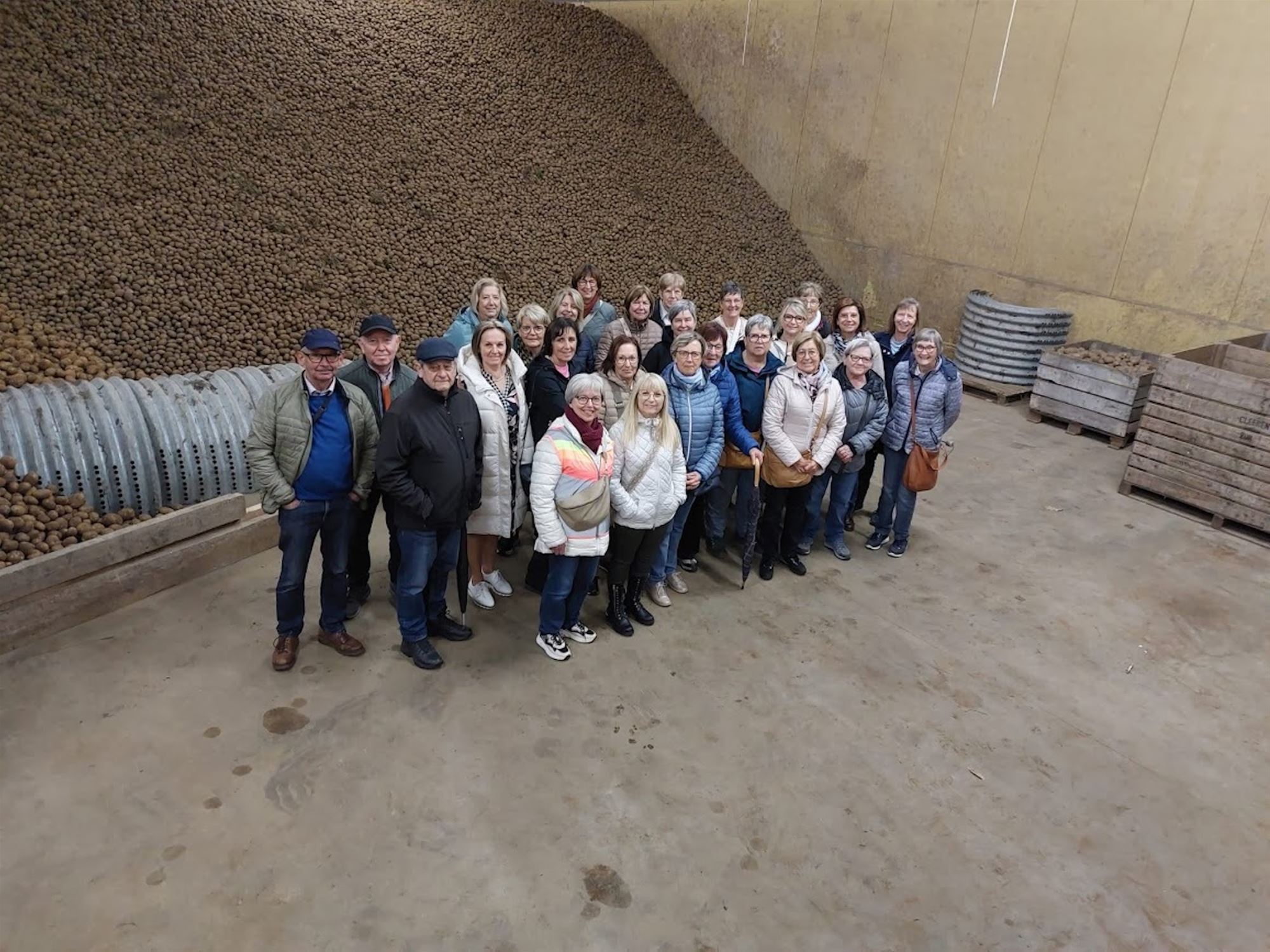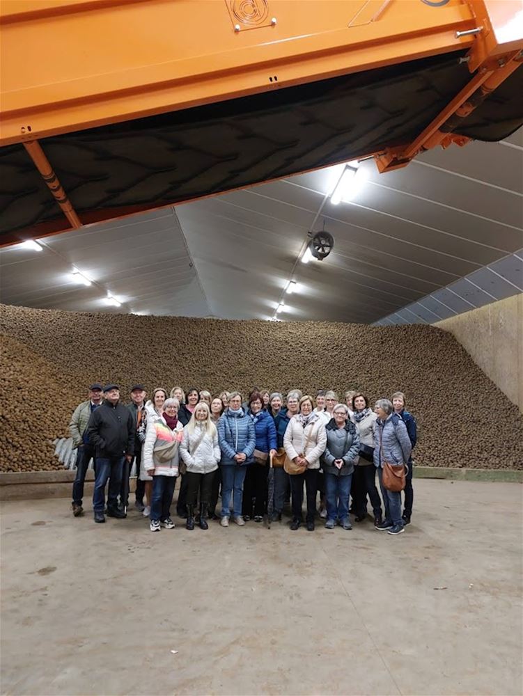 Hoeve Machiels in Beverlo. Ze werden er hartelijk ontvangen door gastvrouw Ann. Zij leidde de groep rond doorheen het bedrijf en gaf uitleg over de verschillende machines. Ze vertelde over de teelt van uien, bieten, kruiden en granen, maar vooral de enorme berg aardappelen was indrukwekkend. Het hele proces van planten tot rooien, drogen, sorteren en bewaren werd uitgelegd.