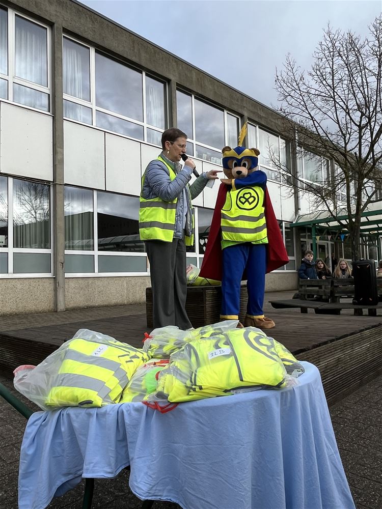 Ook de schepen van Verkeer was aanwezig om samen met Bliksem de fluohesjes uit te delen en de kinderen te feliciteren met