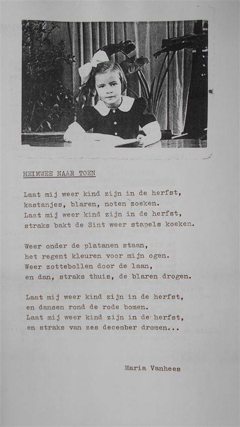 Maria Vanhees uit Beverlo. We zagen het vorige week op de Facebookgroep Heemkunde Beverlo. Het gedicht pas perfect was het doel is van heemkunde en getuigt van een groot nostalgisch gevoel dat van alle tijden is. En die mooie tijd rond Sinterklaas is toch voor elk kind een fantastische herinnering.
