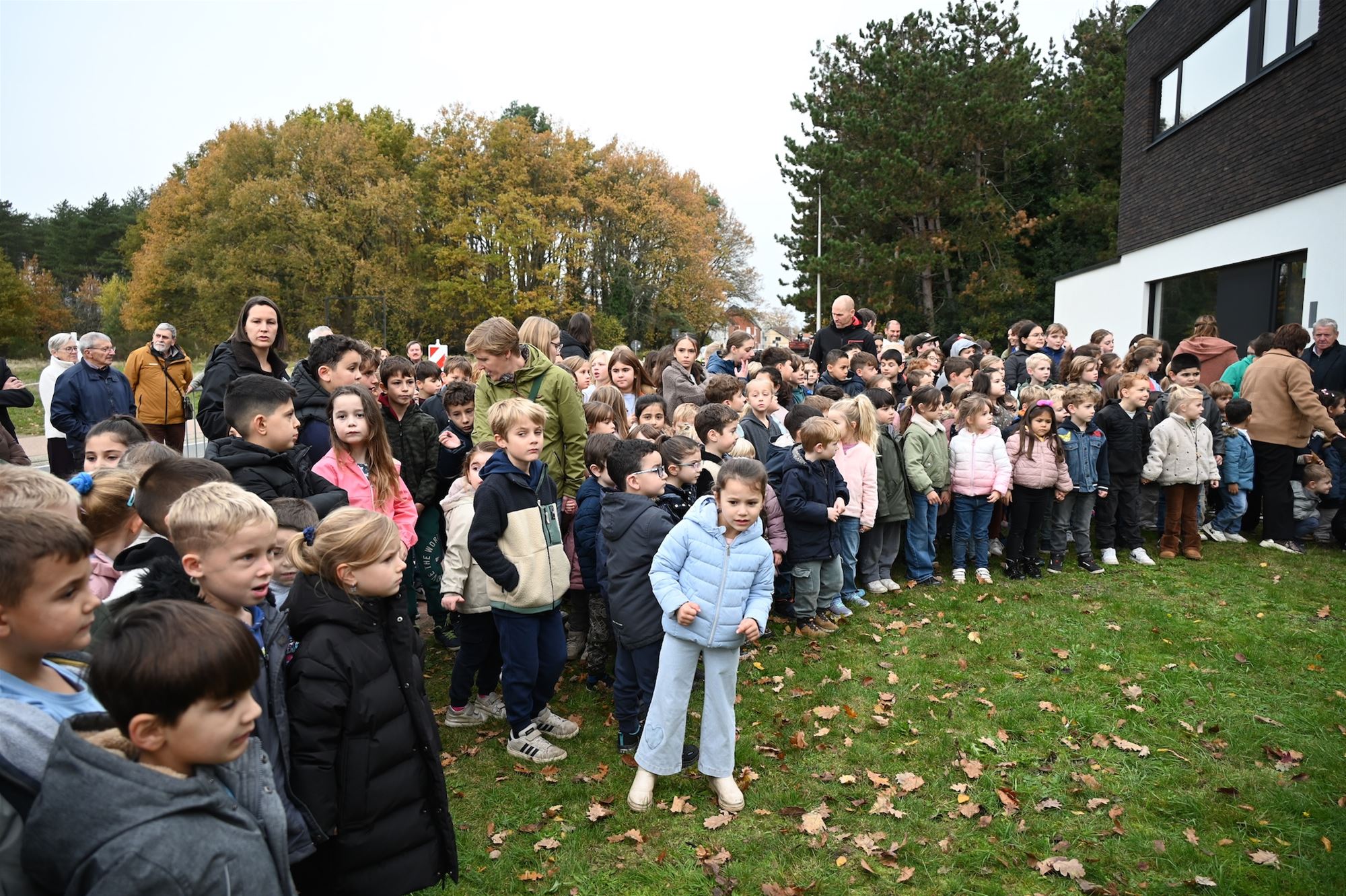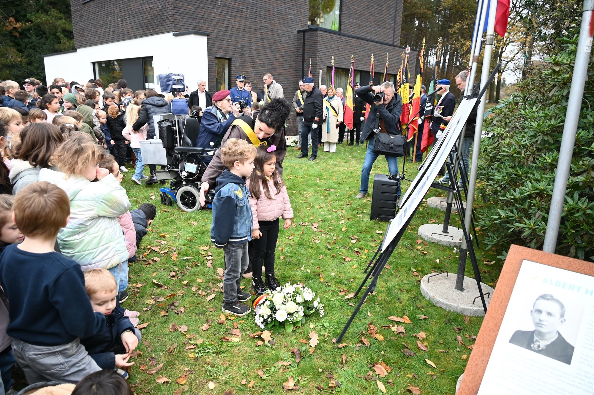De kleuters maakten in de aanloop naar de plechtigheid kaarsen, de leerlingen van de lagere school brachten vredesduiven en gedichten, en de derde graad zong het volkslied.