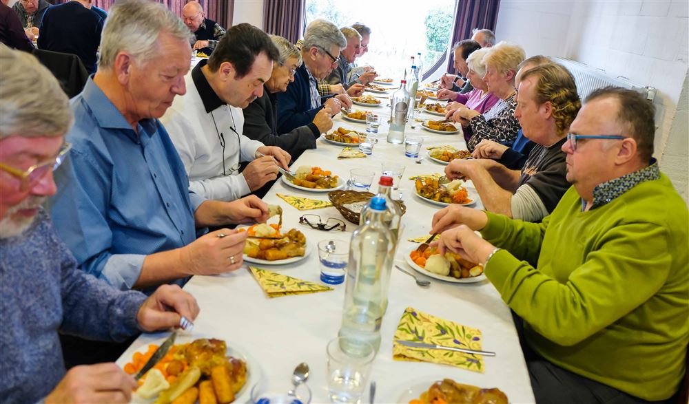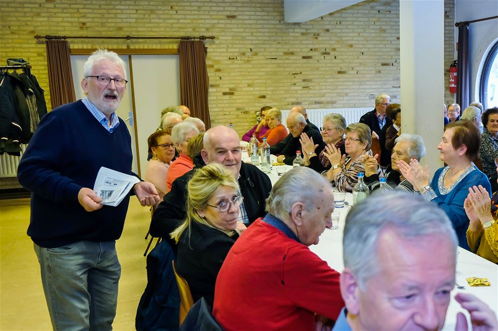 kaarters en kieners van Okra Koersel samen voor een uitgebreide maaltijd. Donderdag 20 februari waren ze met 71 samen in het polyvalent lokaal van feestzaal De Cor, waar geheel gratis een driegangenmenu met drank werd geserveerd. Wekelijks wordt er op donderdag om 14 uur gekaart en gekiend. De verantwoordelijke voor de kaart- en kien namiddag, Jaak Poelmans, wenste iedereen van harte welkom. Verder vertelde hij dat dergelijke feestmaaltijd mogelijk is door de opbrengst van de tap (1,50 euro per consumptie) en het inschrijvingsgeld (1 euro) en zeker niet te vergeten, door het werk van een 10-tal vrijwilligers die alle tafels plaatsen en nadien weer netjes opruimen. Deze mensen kregen dan een ook een spontaan applaus. Het motto is: deelnemen is belangrijker dan winnen, al wordt er soms fel gestreden voor die overwinning. Om 12 uur werd er gestart aan het feest en om 14 uur begonnen de wedstrijden: de kaarters met 13 tafels van 4 mannen of vrouwen de kieners met 12 vrouwen. (