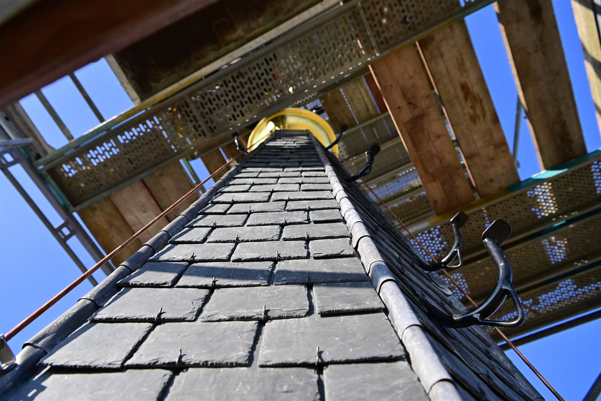 Zo komt er een einde aan de restauratie van de kerktoren. "De toren is helemaal vernieuwd zowel het gebinte als de vloeren in hout. En de leien werden allemaal vervangen", vertelt Romain nog.