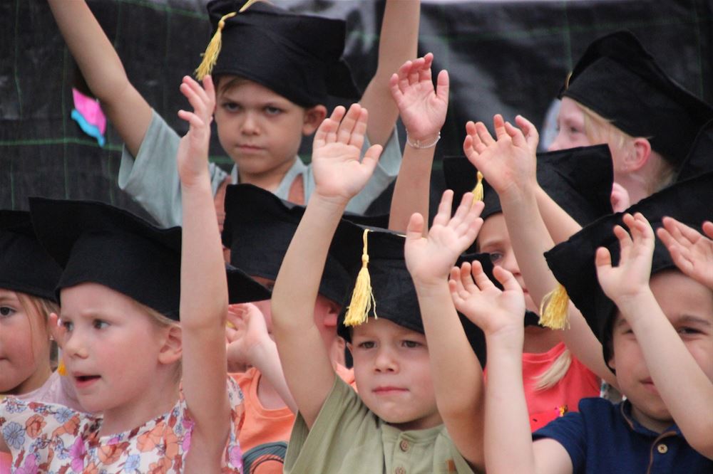 De kleuters varen uit naar het eerste leerjaar om te leren lezen, schrijven, rekenen.