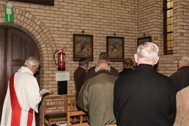 ingetogen minuut stilte voor de slachtoffers voor de terreurdaden in Brussel. Dan gingen de gelovigen samen met diaken Willy biddend en herdenkend langs de veertien kruiswegstaties, waar telkens werd stilgestaan voor een korte lezing en een kort gebed. (Jean Beerten)