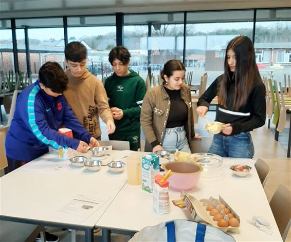 tijdens de les wiskunde wafels bakken in het kader van massamaten, inhoudsmaten herleiden en afmeten.