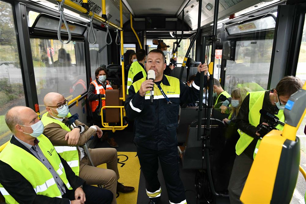 Alle verplaatsingen tijdens de duurzaamheidstour gebeuren in een speciaal bestickerde hybride bus van De Lijn.