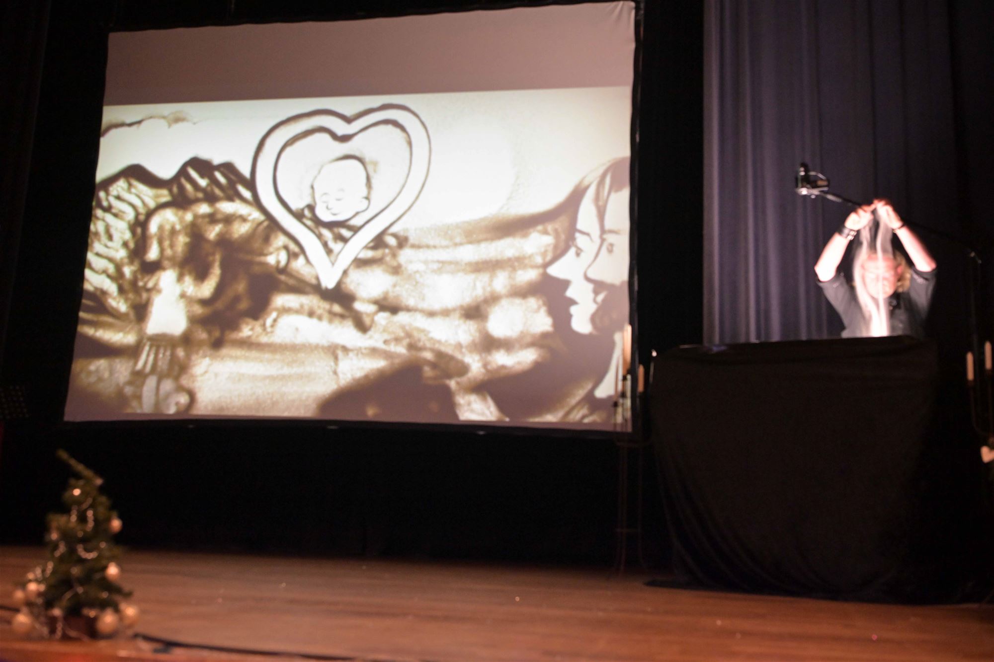 voor de zandkunstenaar die het verhaal van de geboorte van Jezus