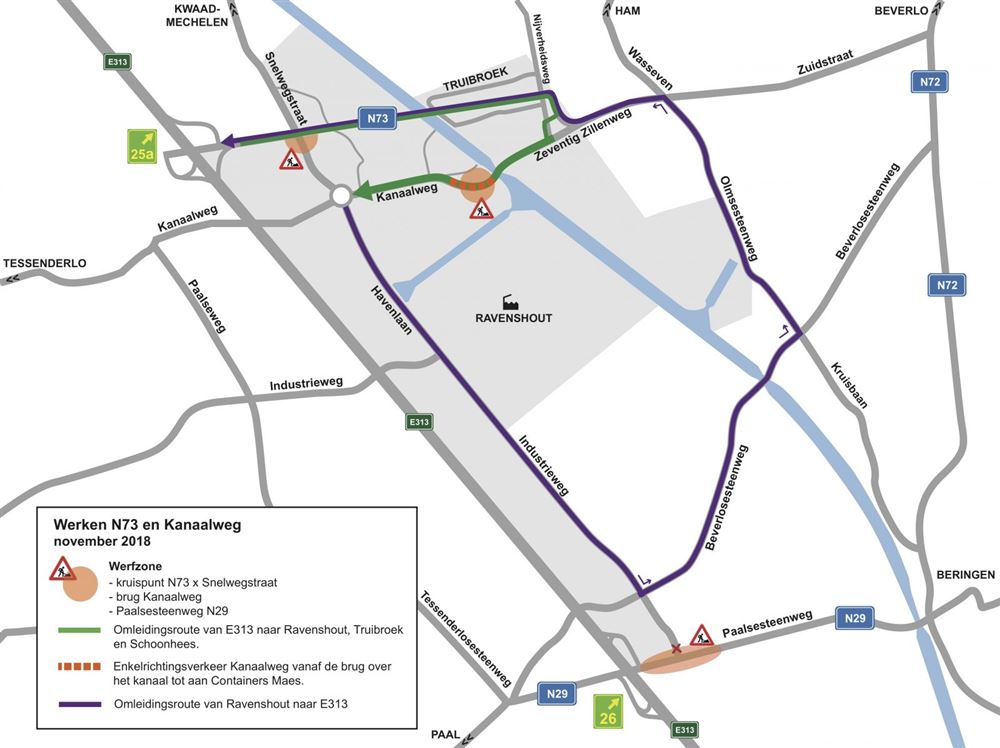 Concreet betekent dit dat het verkeer dat van de E313 komt via de nieuwe N73, het kruispunt aan de Nijverheidsweg en de Kanaalweg naar Truibroek, Ravenshout of Schoonhees rijdt (groene route op de kaart).