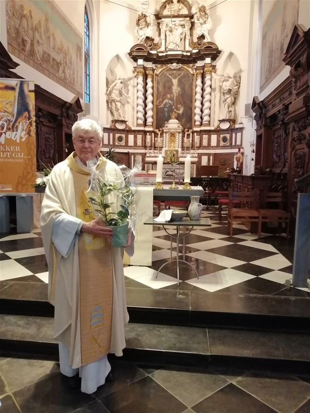 "Witte donderdag, dag dat wij gedenken dat Jezus met zijn leerlingen aan tafel zat. Hij deelde brood en wijn. De priesters van vandaag willen dit ook nog steeds doen. Daarom zetten we hen één keer per jaar in de bloemen", zegt Els Geukens.